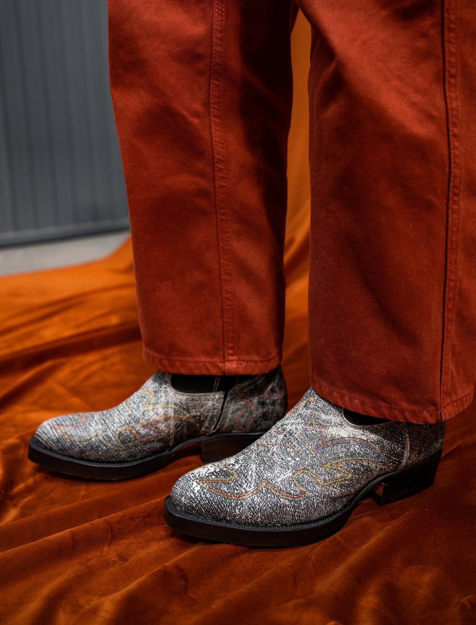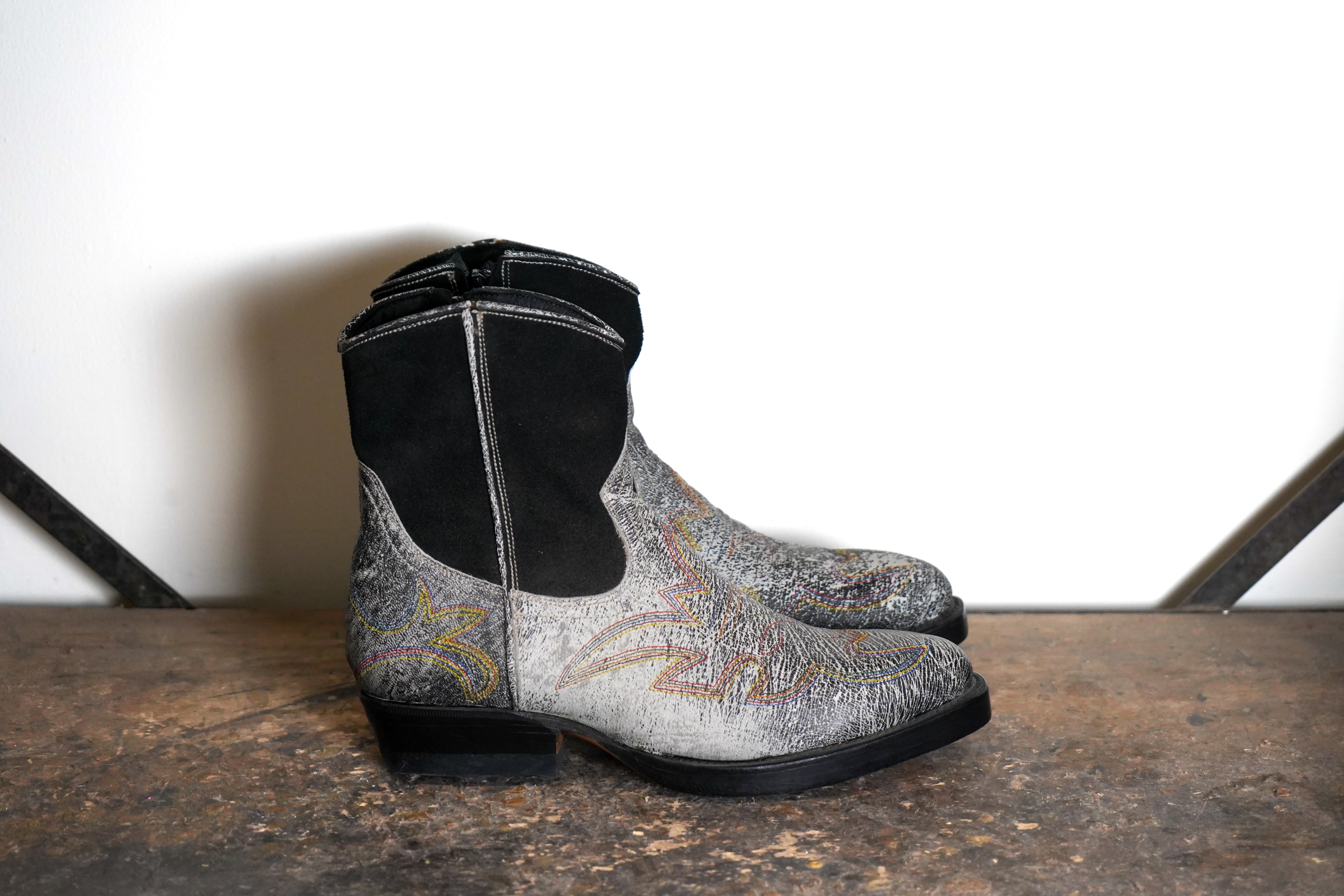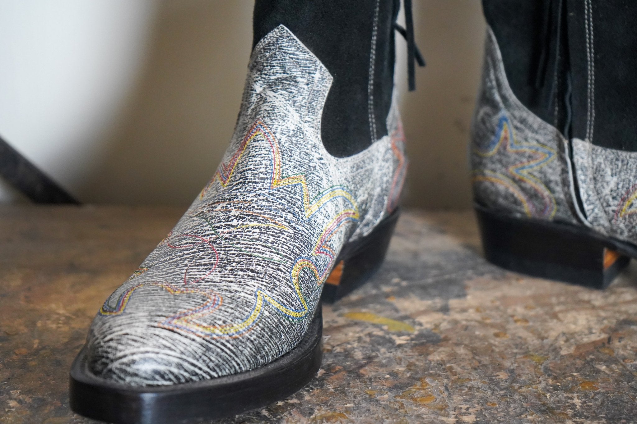 Crafted with precision and tradition, this handmade western boot features a Baby goat disstressed leather/suede leather upper, complemented by a soft Calf Leather lining for comfort. Built with a mini welt construction, brass-nailed and wooden-pegged waist, it boasts a vegetable-tanned leather outsole and calf leather insole for durability. Reinforced with a leather heel counter and toe stiffener, it includes hand-forged Penny nail details, handmade Punto Marcado, and intricate hand-stitched shaft embroidery.