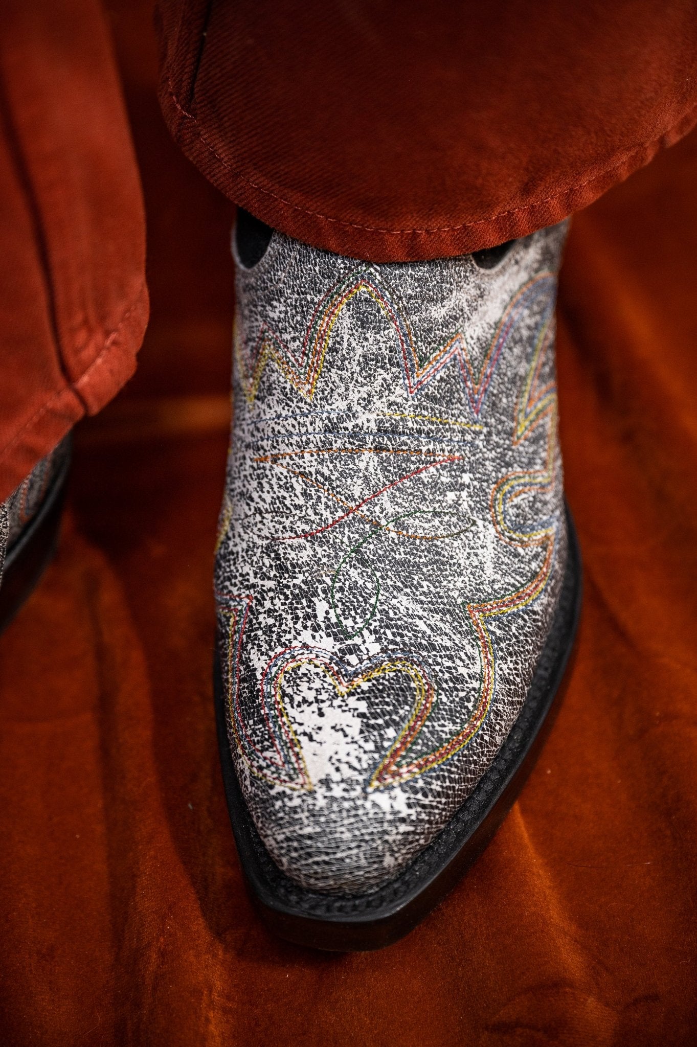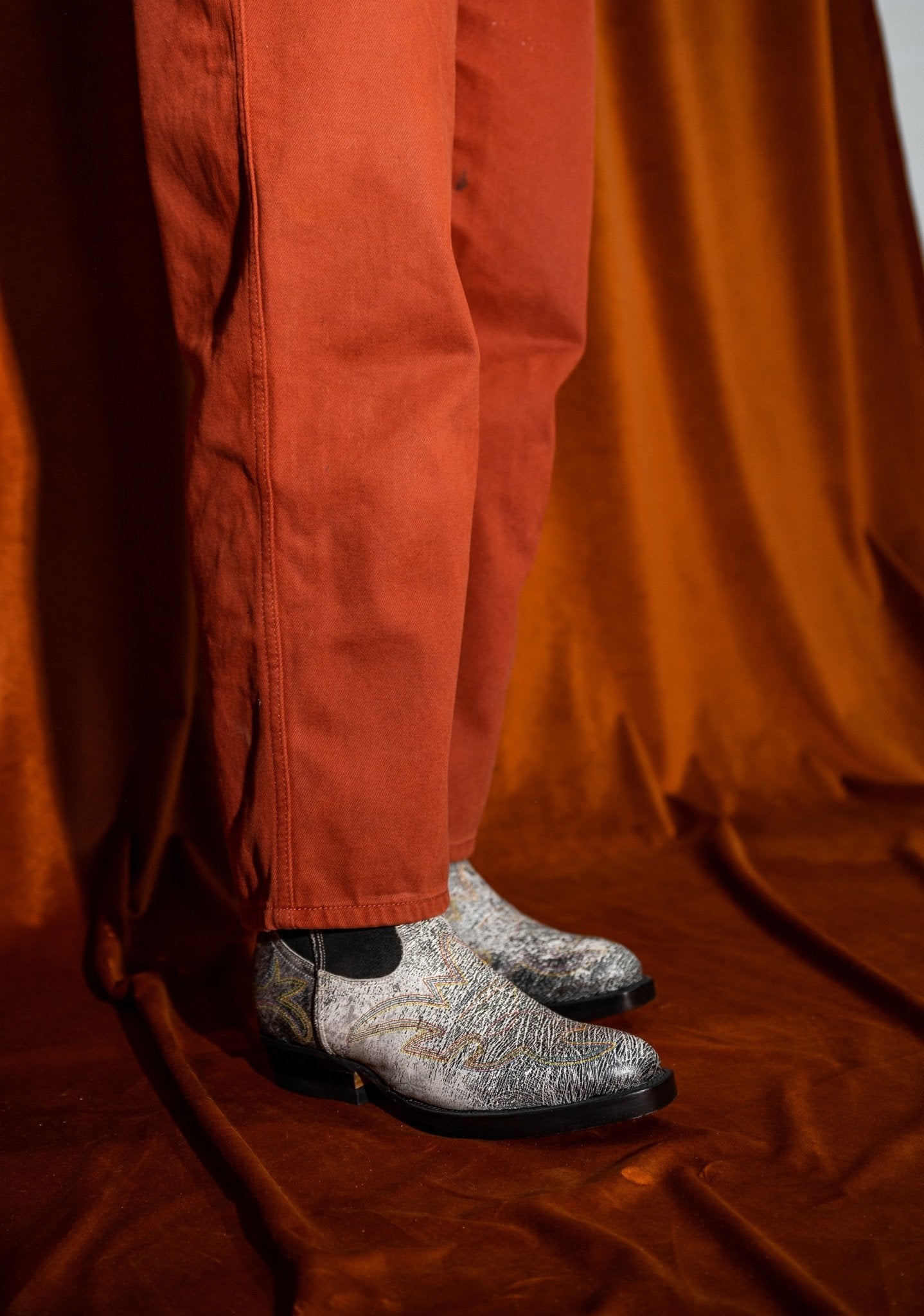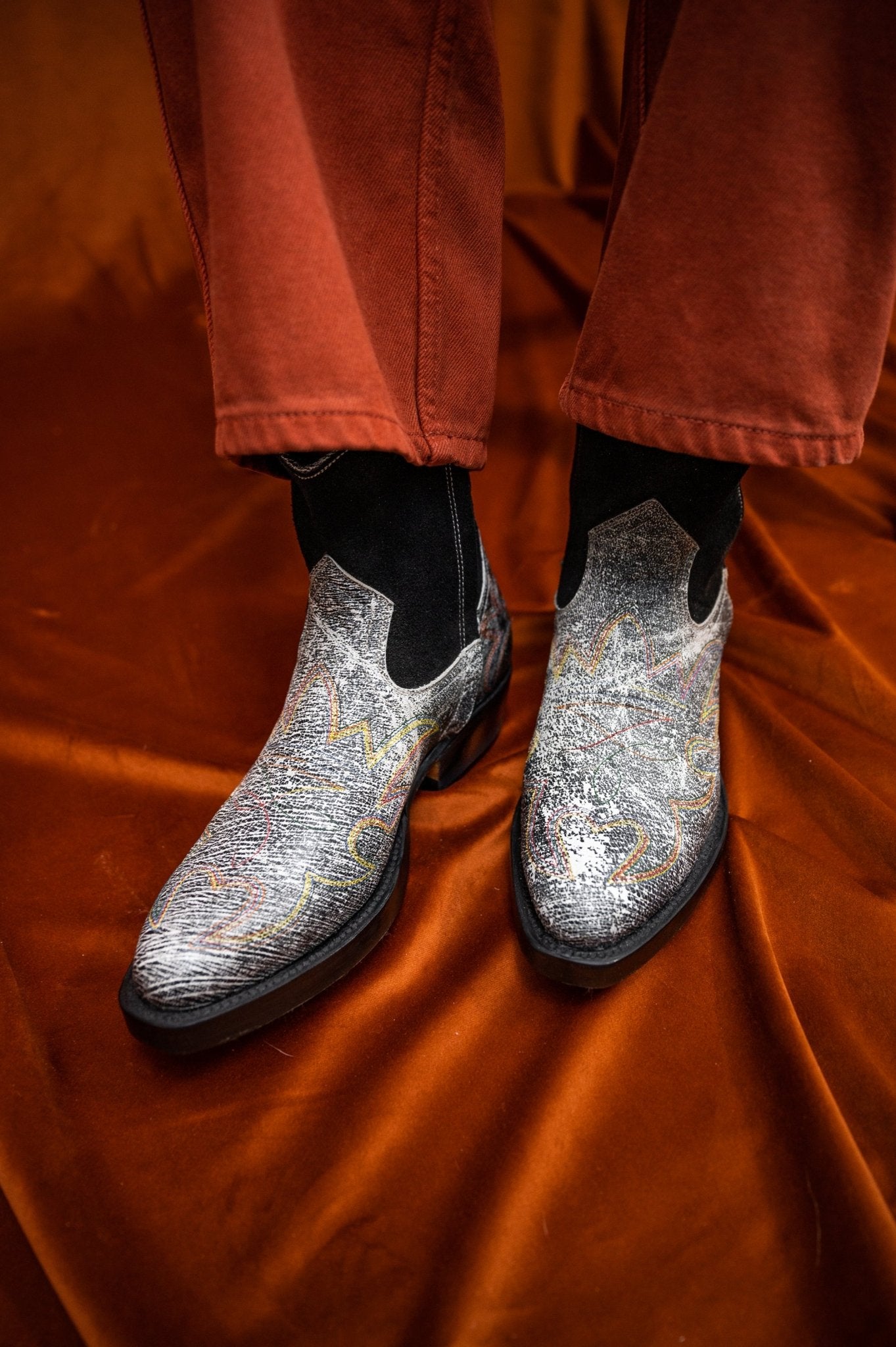 Crafted with precision and tradition, this handmade western boot features a Baby goat disstressed leather/suede leather upper, complemented by a soft Calf Leather lining for comfort. Built with a mini welt construction, brass-nailed and wooden-pegged waist, it boasts a vegetable-tanned leather outsole and calf leather insole for durability. Reinforced with a leather heel counter and toe stiffener, it includes hand-forged Penny nail details, handmade Punto Marcado, and intricate hand-stitched shaft embroidery.
