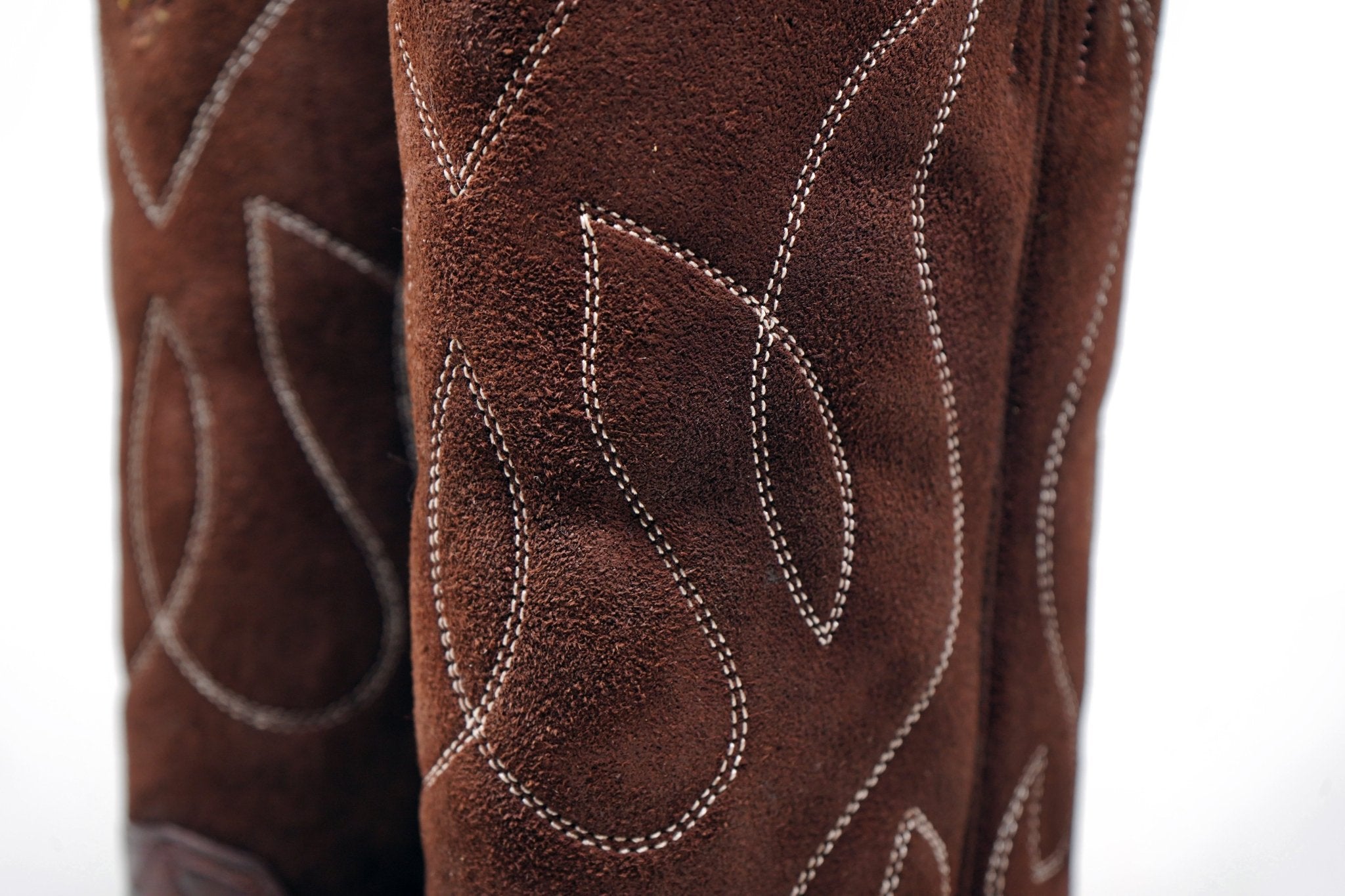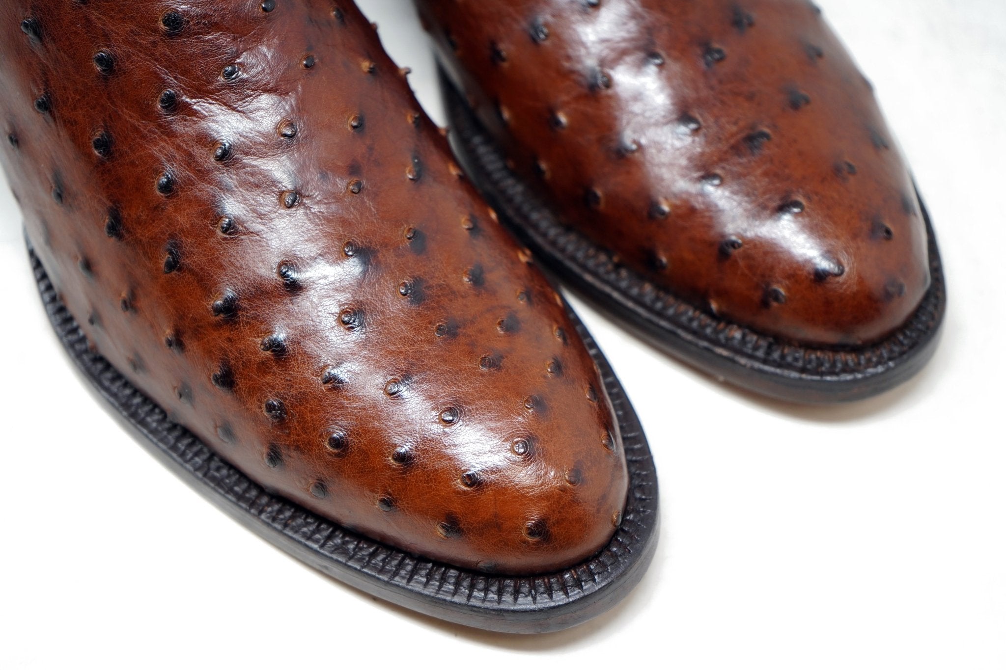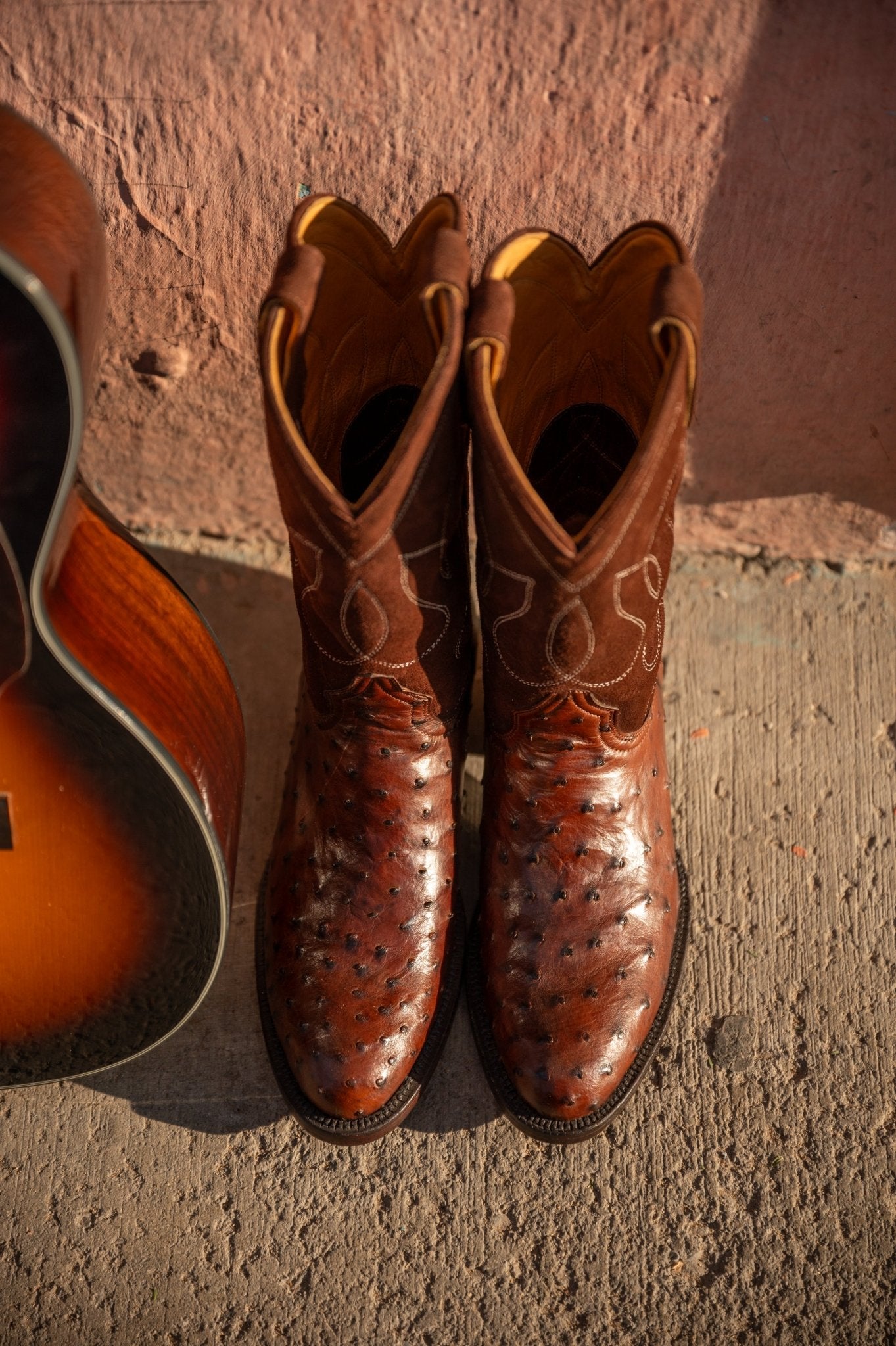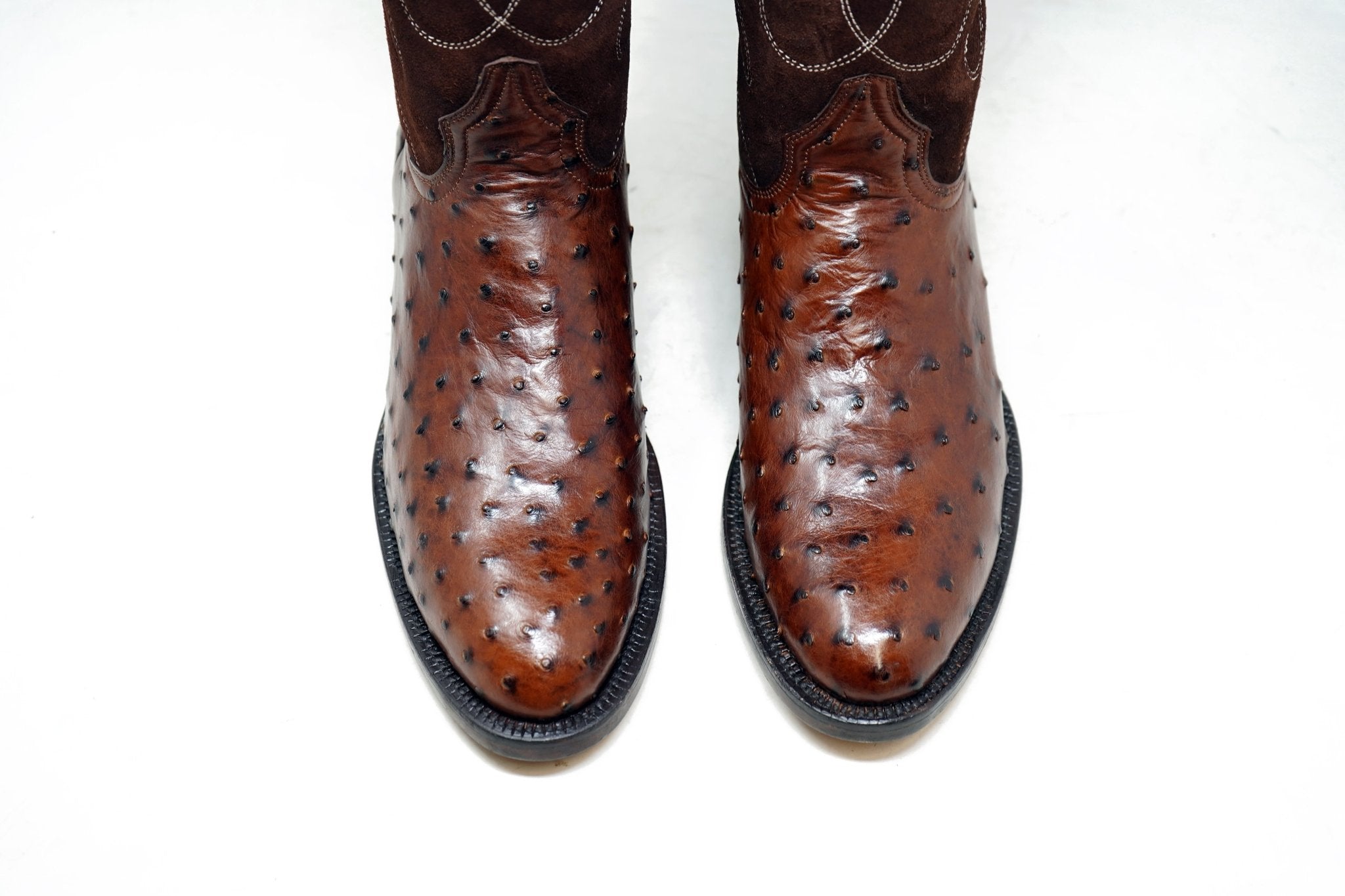 These handcrafted Western boots embody luxury and rugged elegance. The rich tan suede upper, adorned with intricate flame-like stitching, pairs beautifully with the exotic ostrich leather lower, creating a striking contrast. Built with meticulous attention to detail, the sturdy welt construction, reinforced heel, and premium leather sole ensure durability and comfort. Lined with soft leather, these boots offer a perfect blend of craftsmanship and timeless style, making them a standout choice for those who appreciate quality and authenticity.