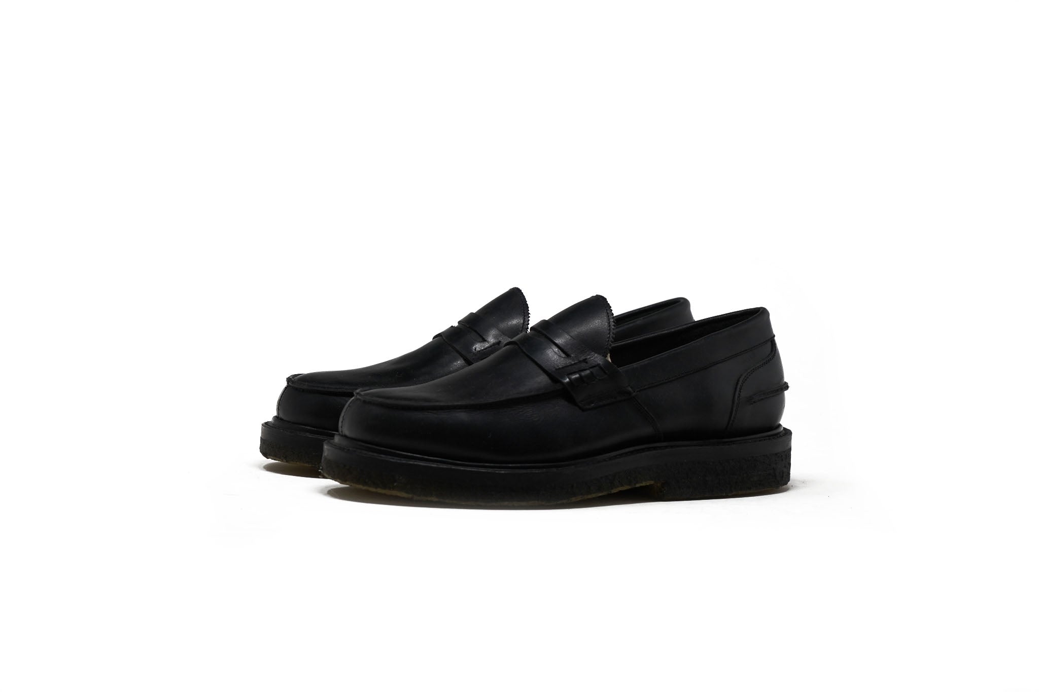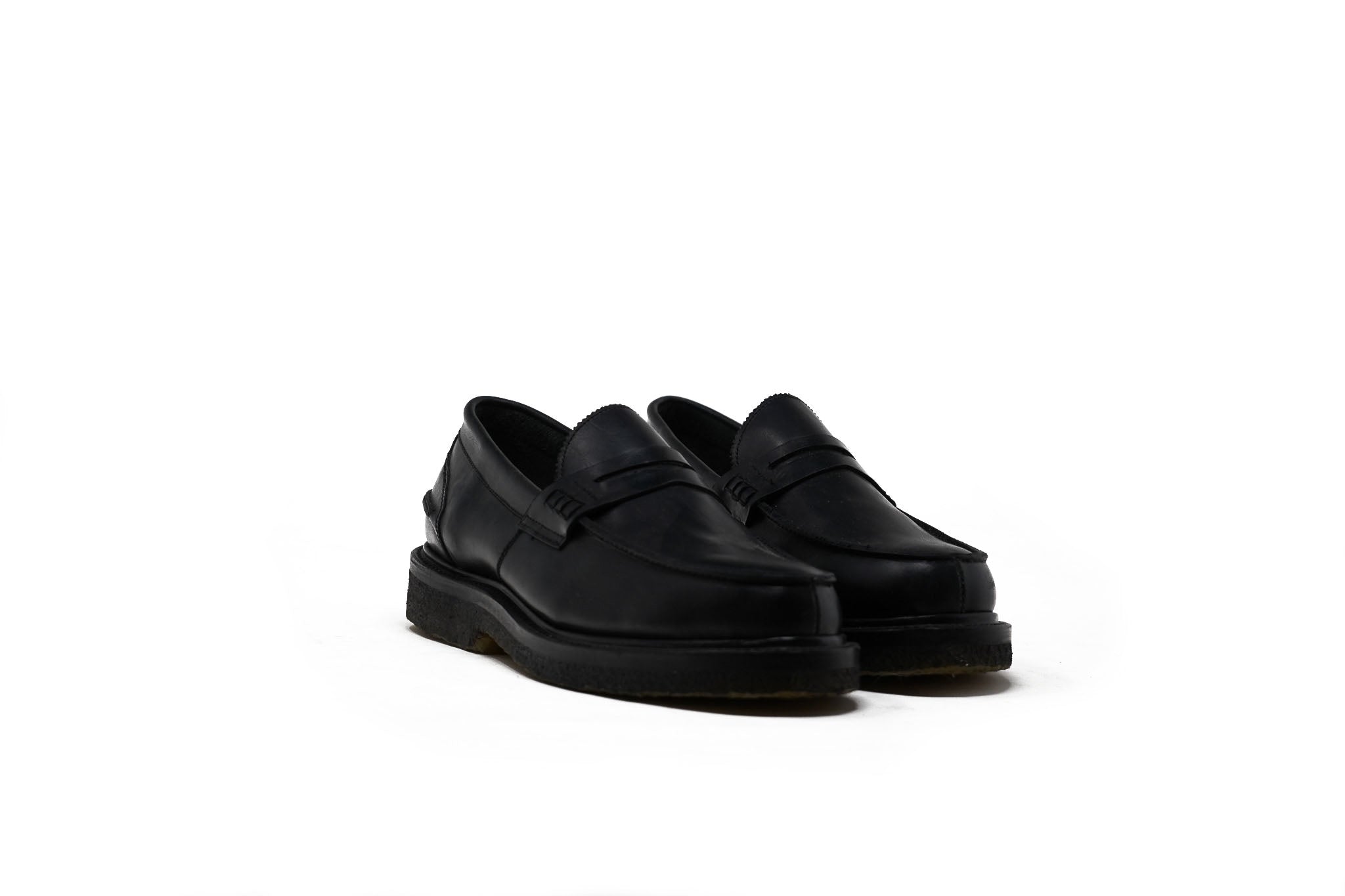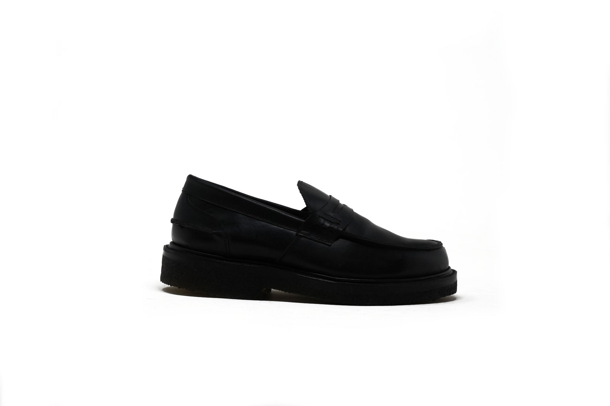 Traditional Penny loafer silhouette with a cowhide leather goodyear welt construction, and a natural crepe outsole.