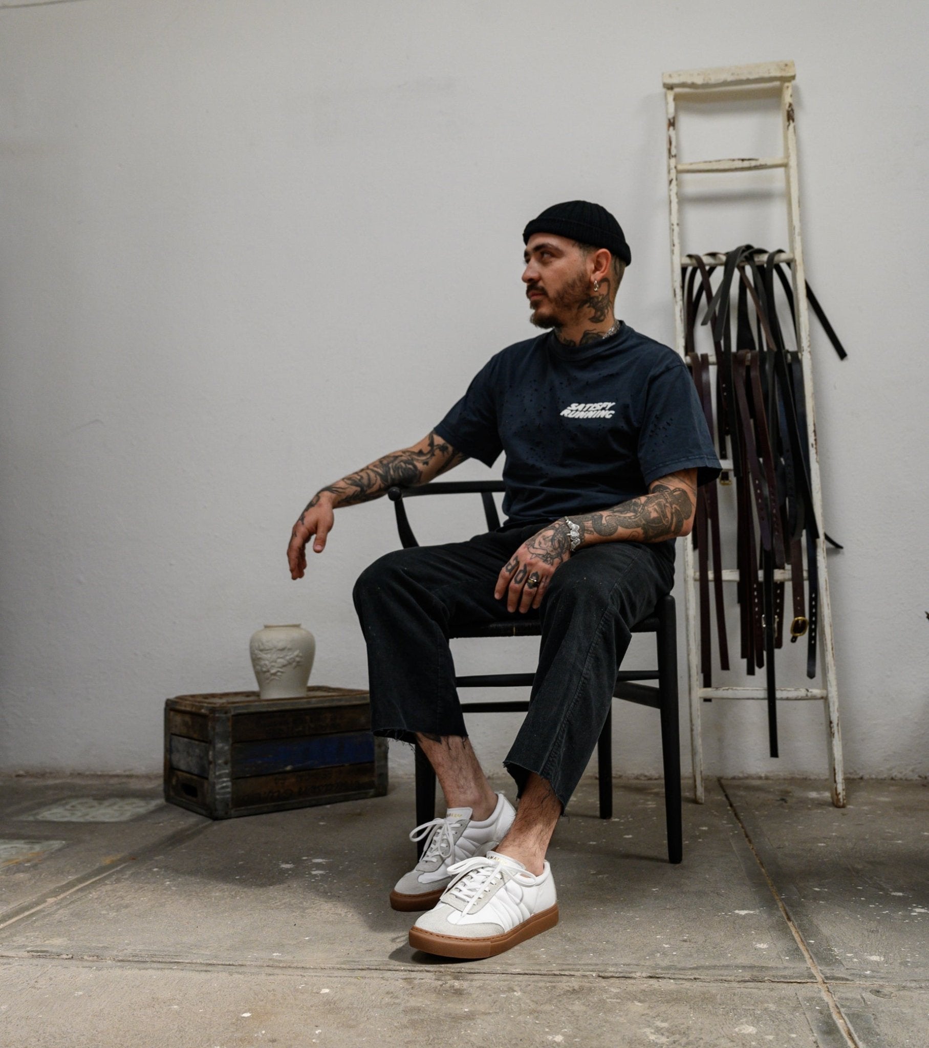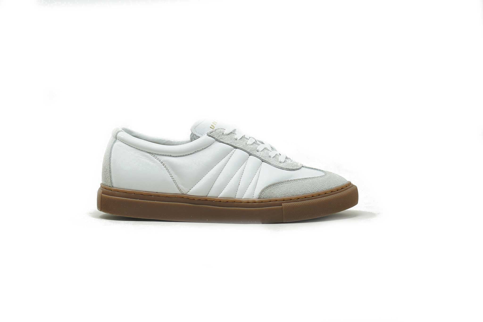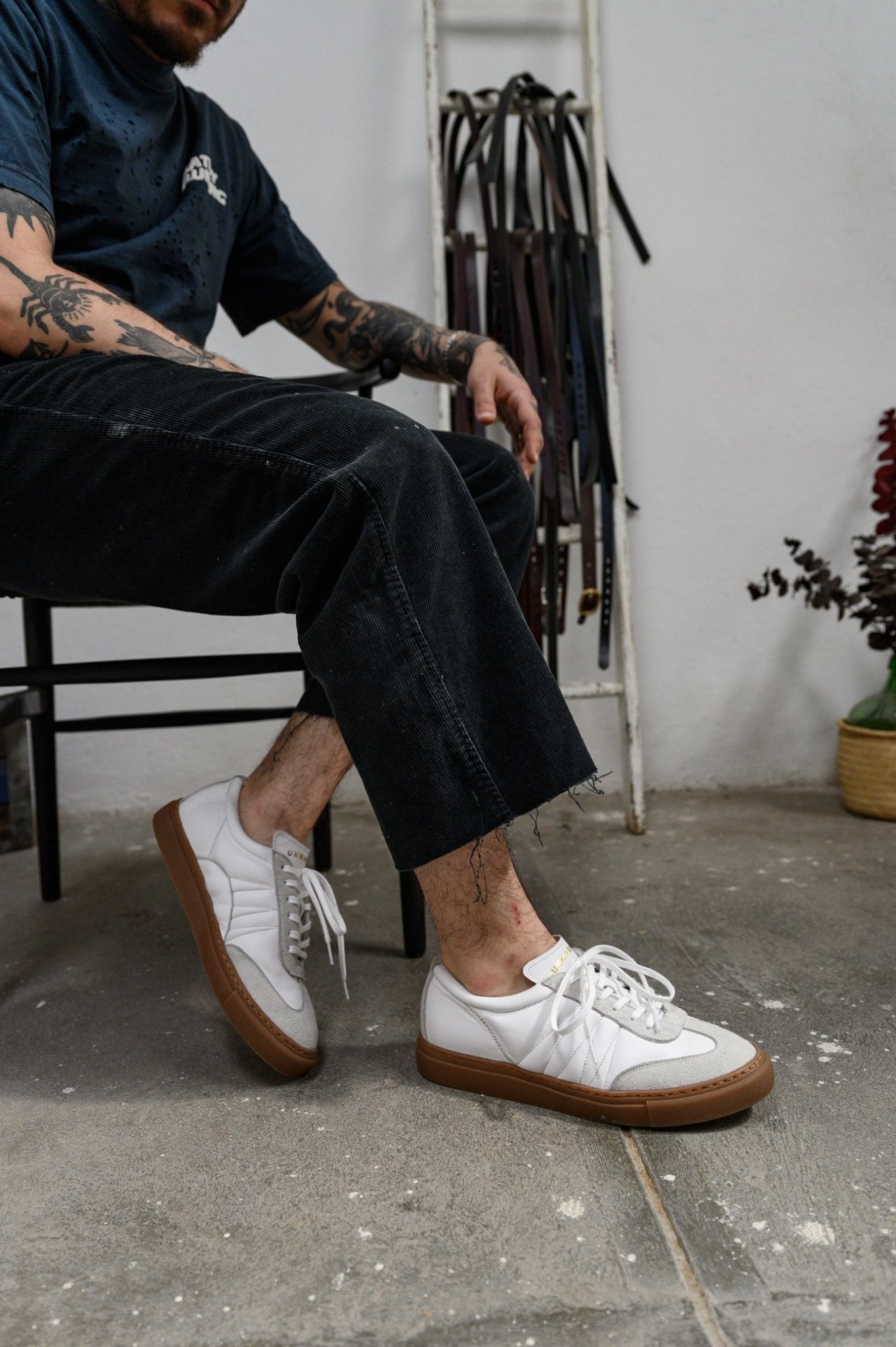 The MX1986 sneakers were inspired by a pair of football soccer shoes made in Mexico for the 1986 World Cup. The characteristic M padded embroidery is entirely made by hand by our skilled artisans. The toe is covered with a double layer of leather to improve durability.