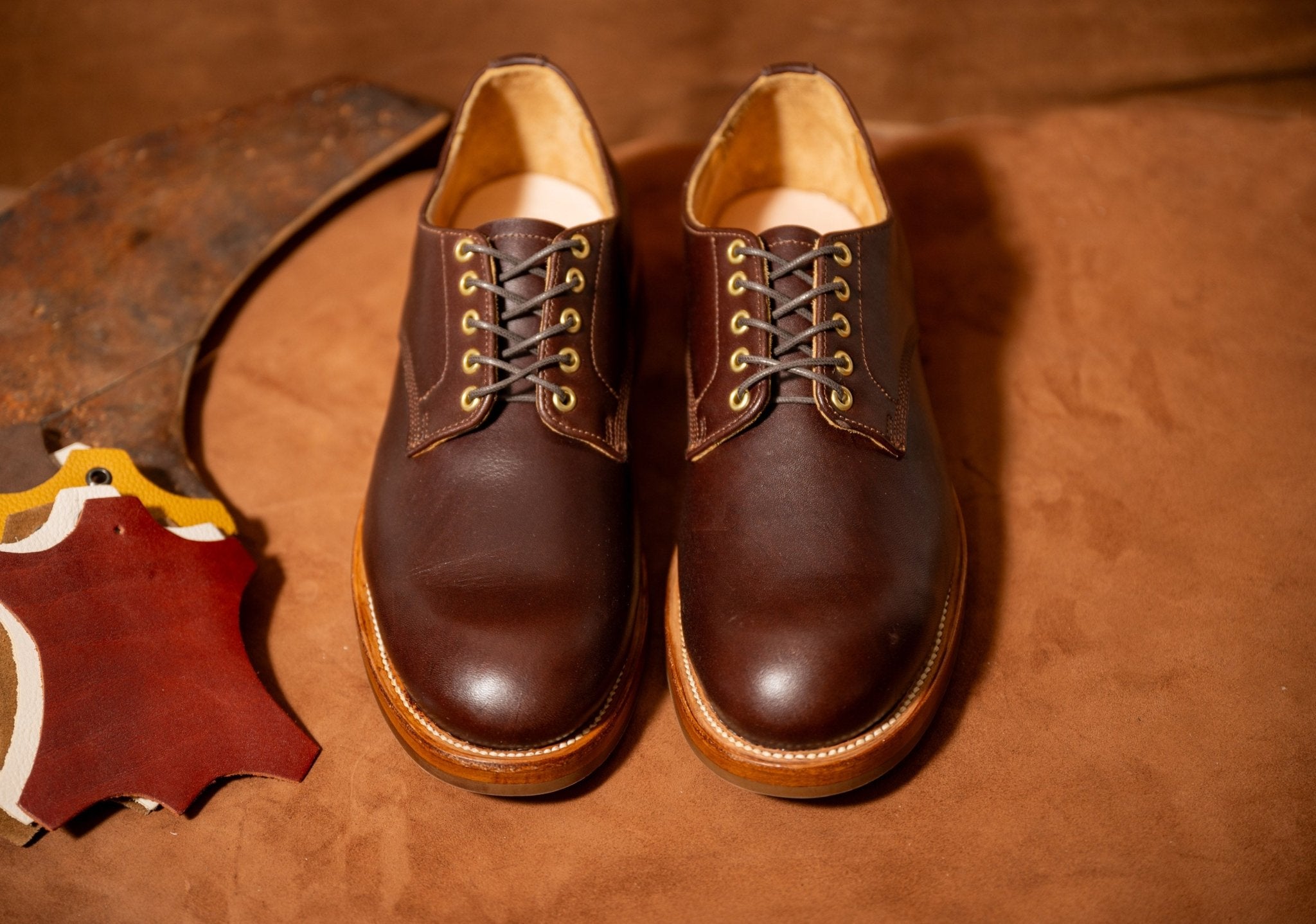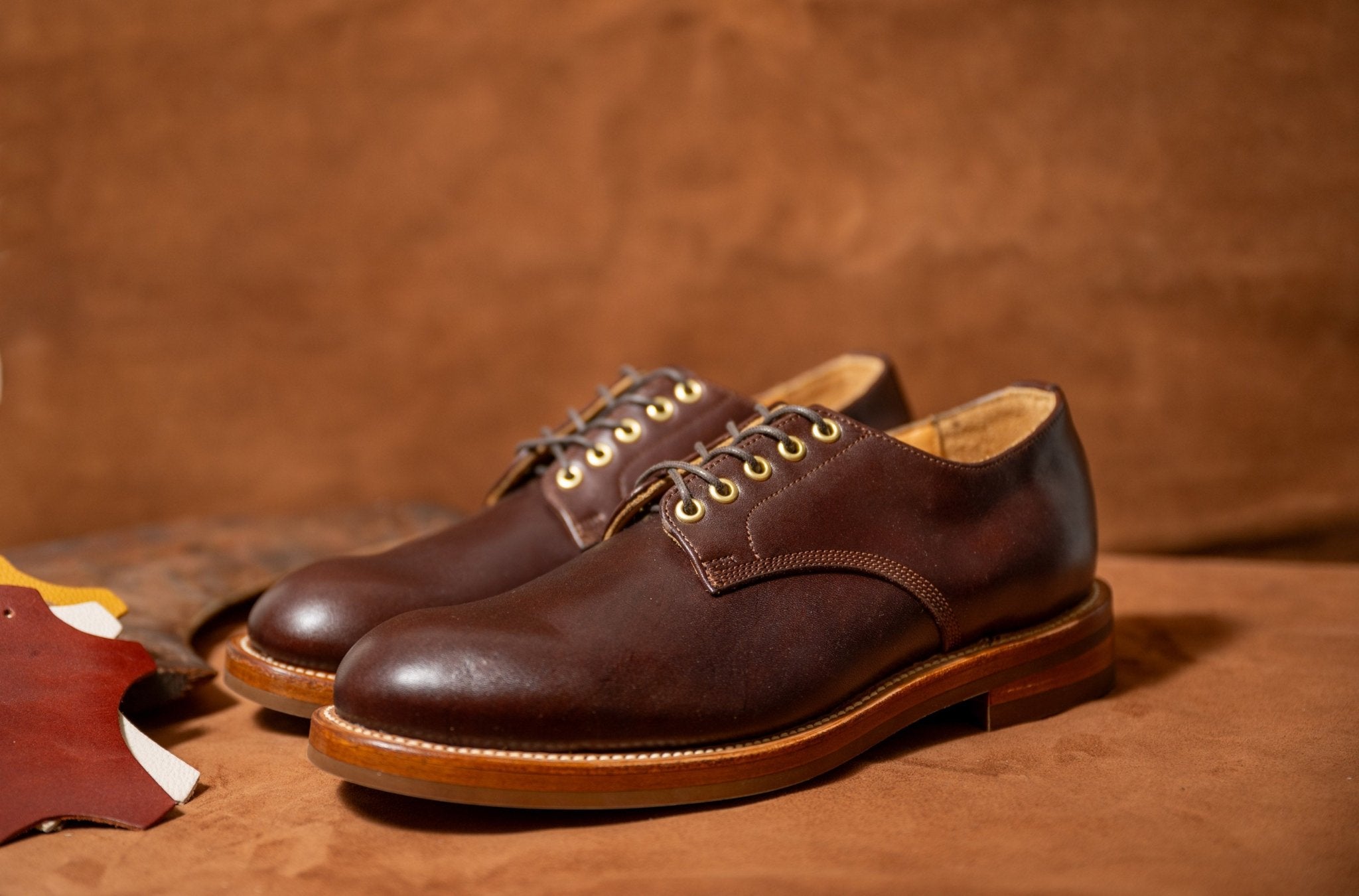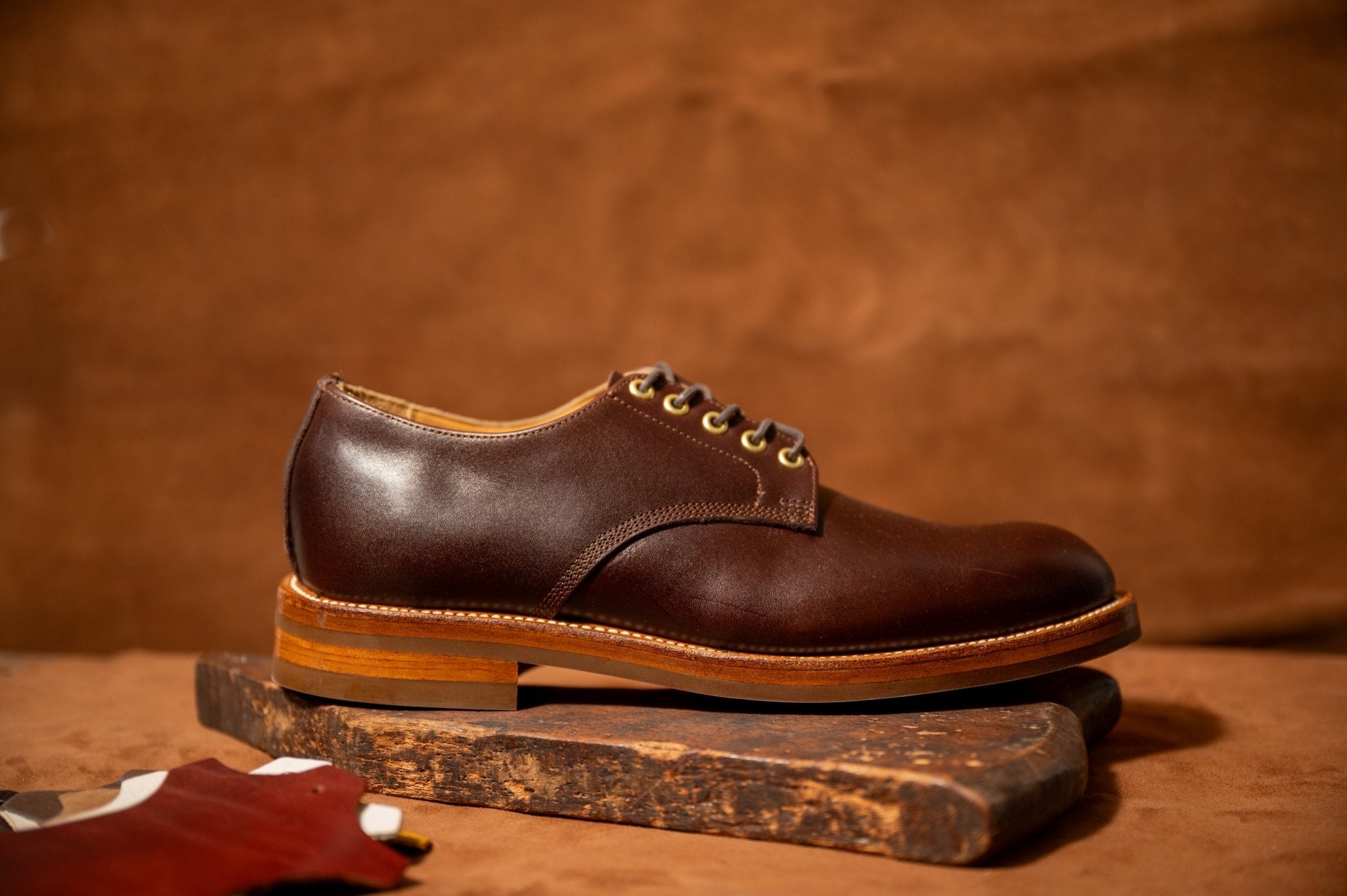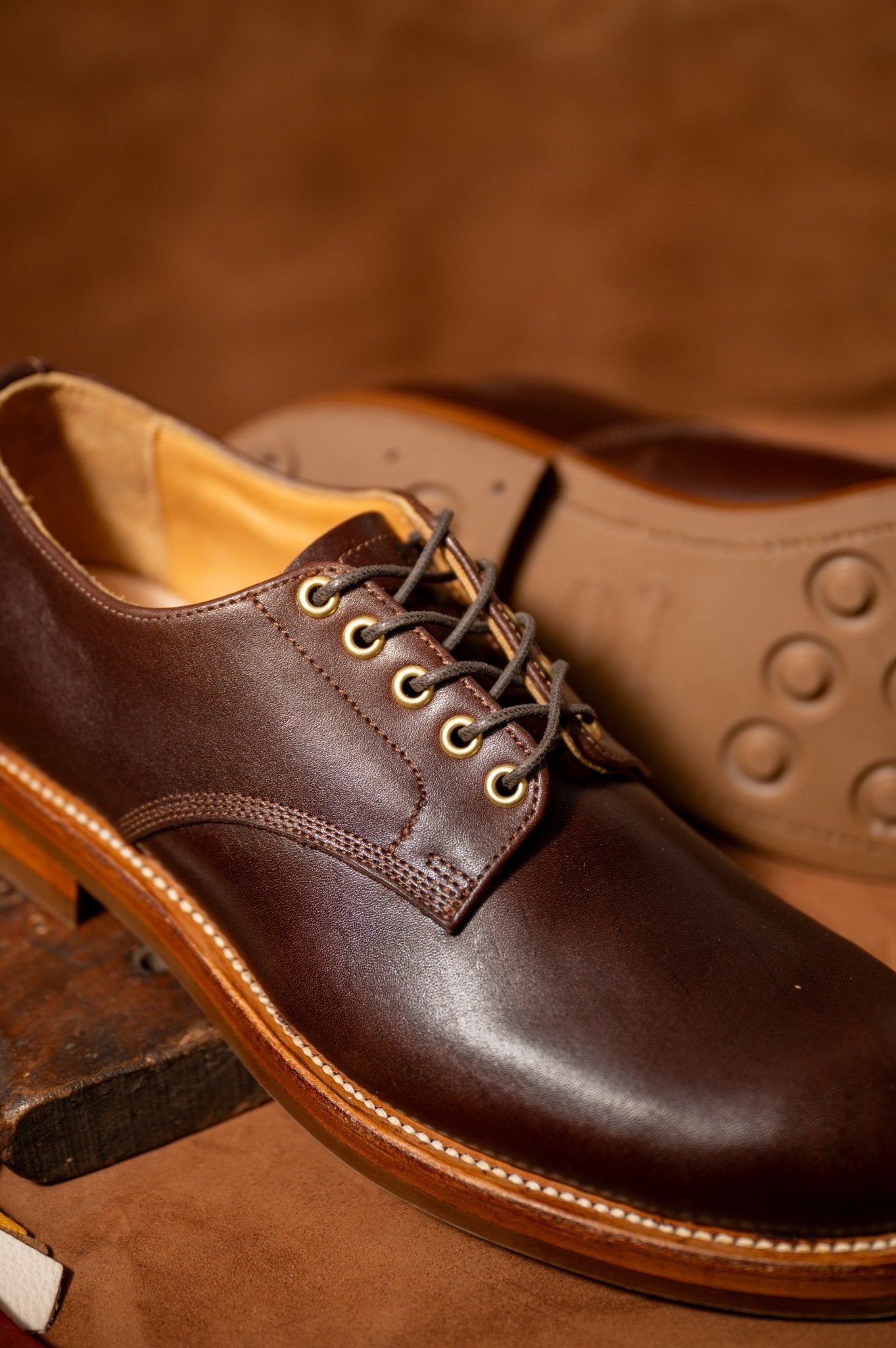Classic Derby shoes featuring a unique Brown-colored upper in handsome pull-up leather, complemented by a veggie-tanned leather insole and Itshide studded Camel sole. Each pair is meticulously crafted over thirty days, with more than 200 individual steps, making these shoes a truly exceptional and one-of-a-kind creation