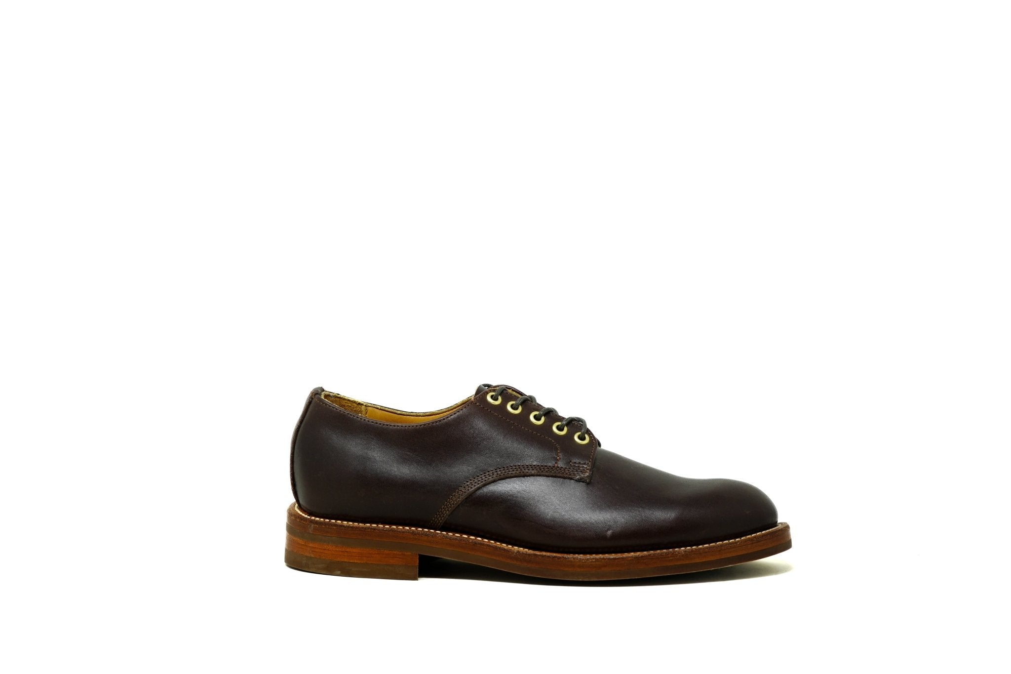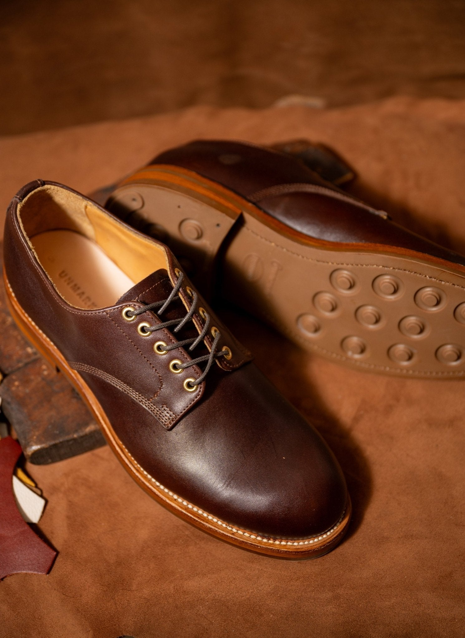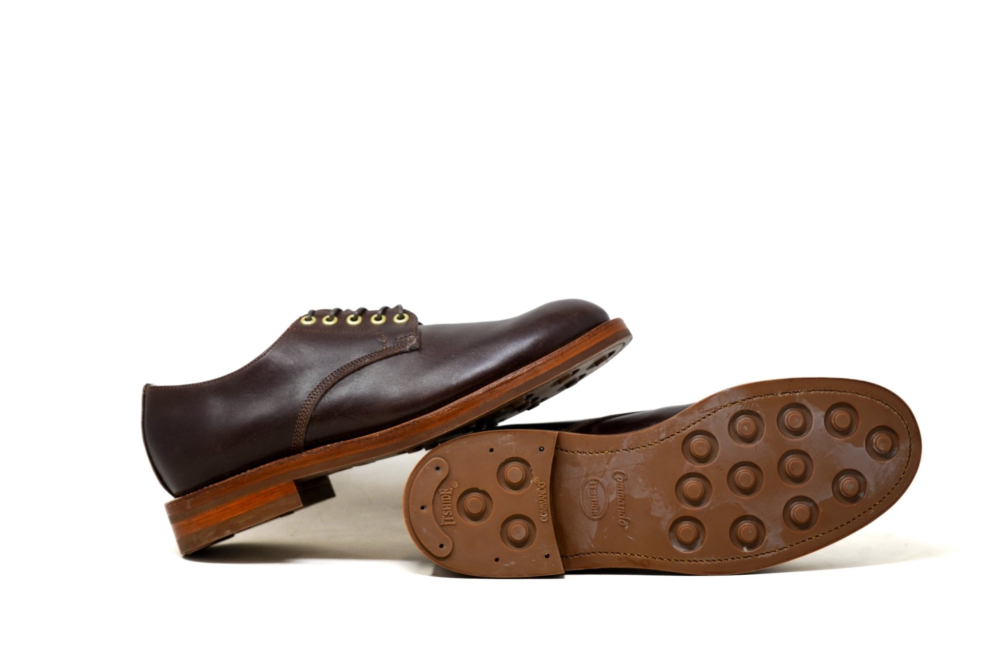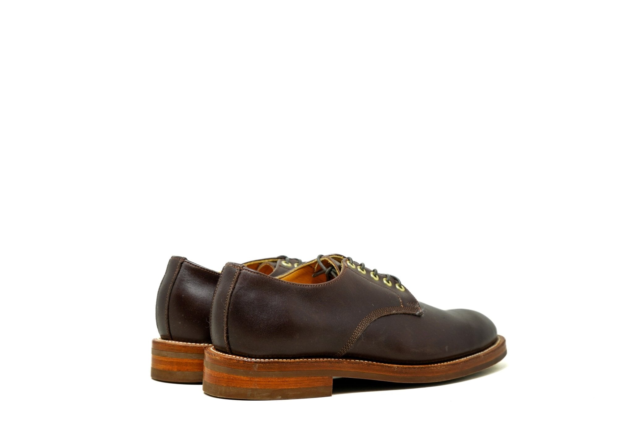 Classic Derby shoes featuring a unique Brown-colored upper in handsome pull-up leather, complemented by a veggie-tanned leather insole and Itshide studded Camel sole. Each pair is meticulously crafted over thirty days, with more than 200 individual steps, making these shoes a truly exceptional and one-of-a-kind creation