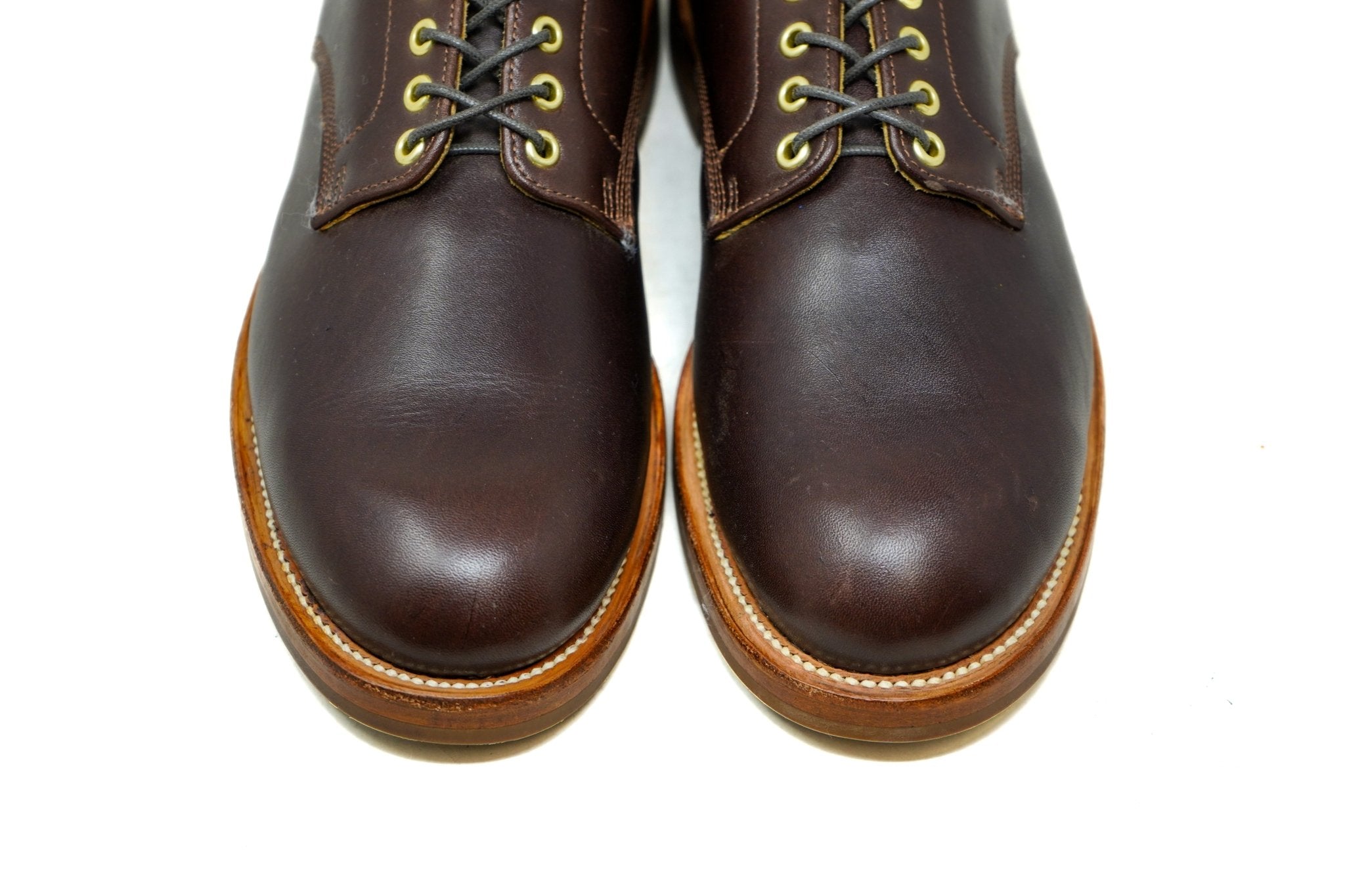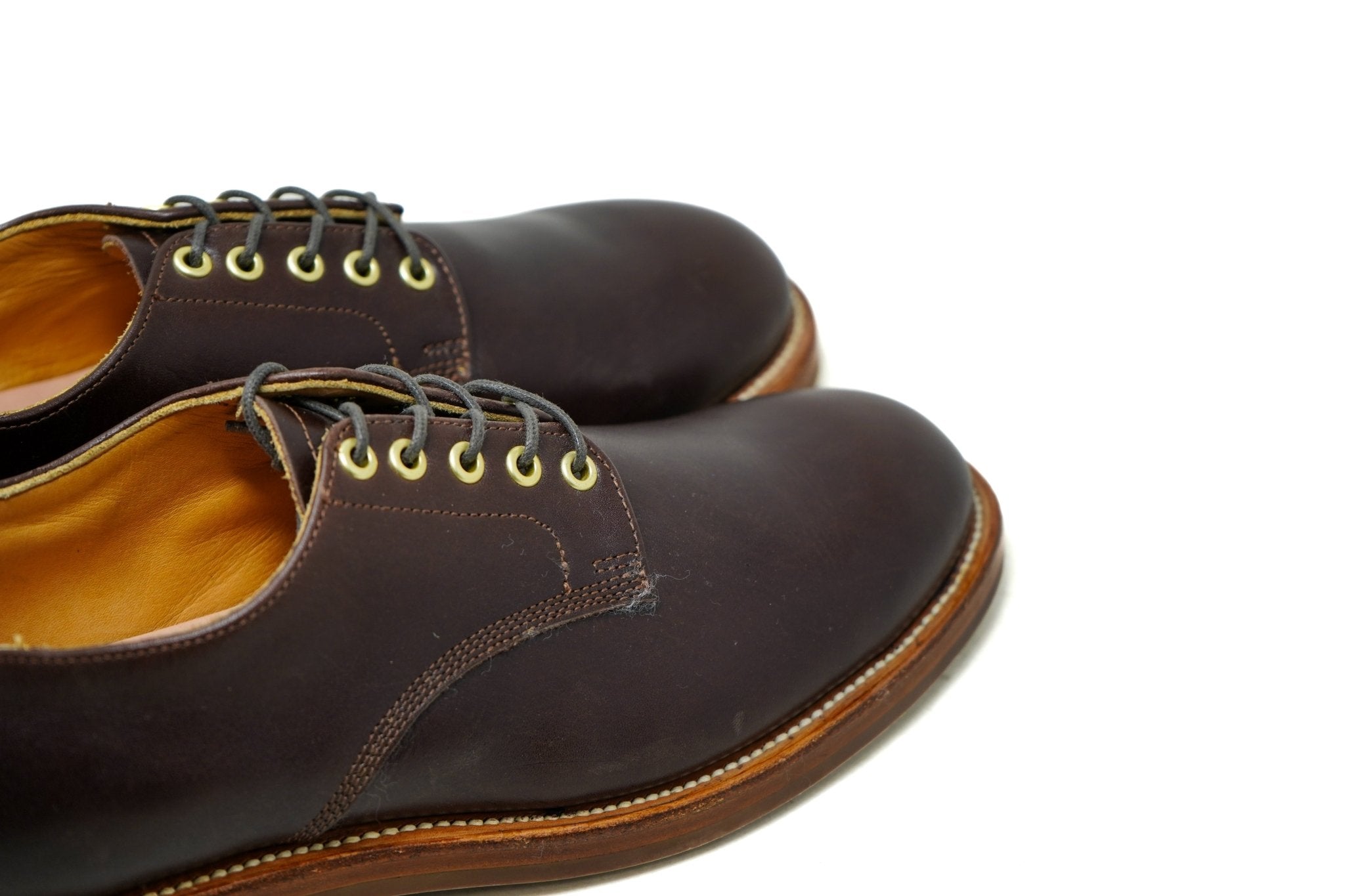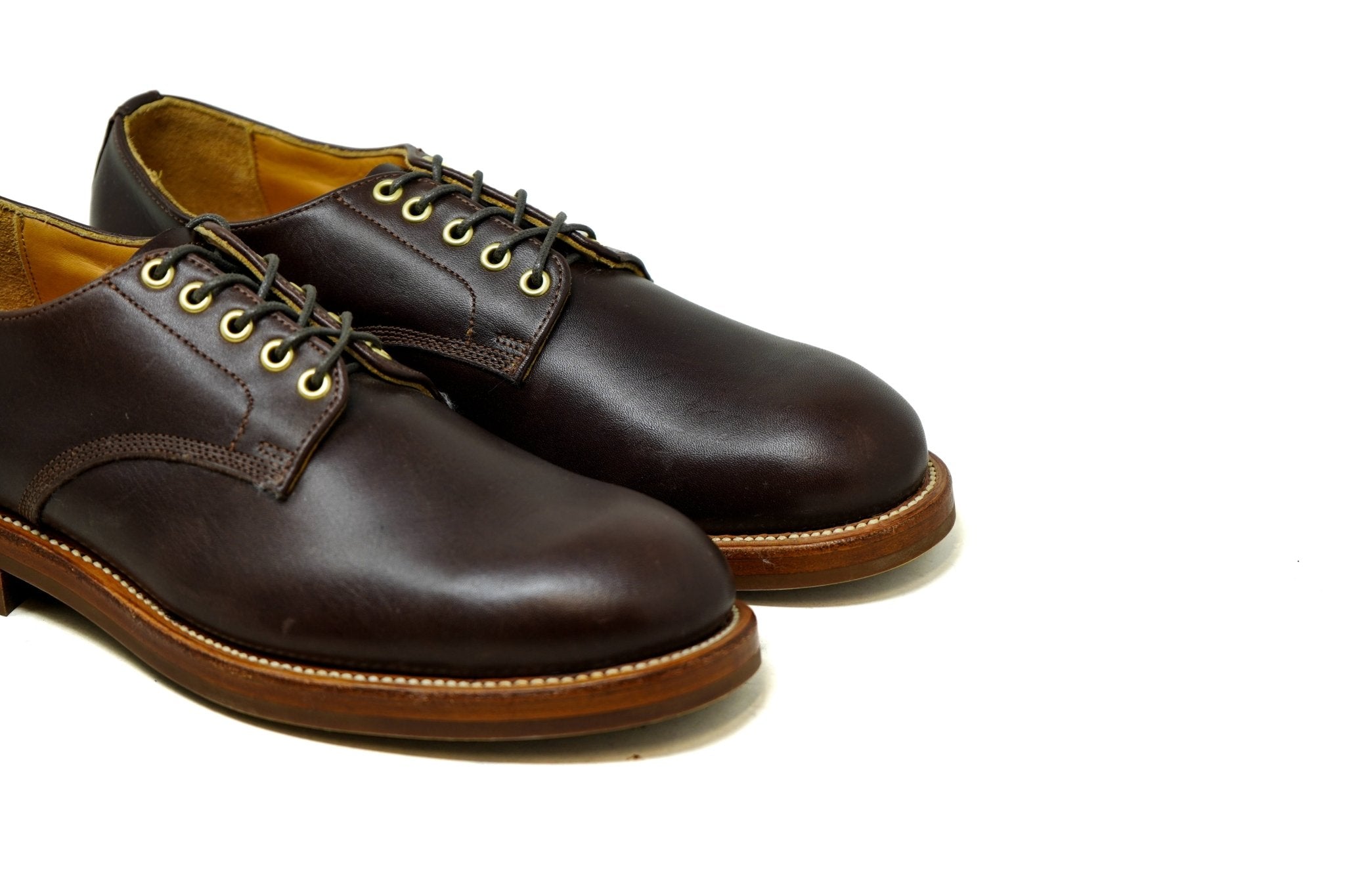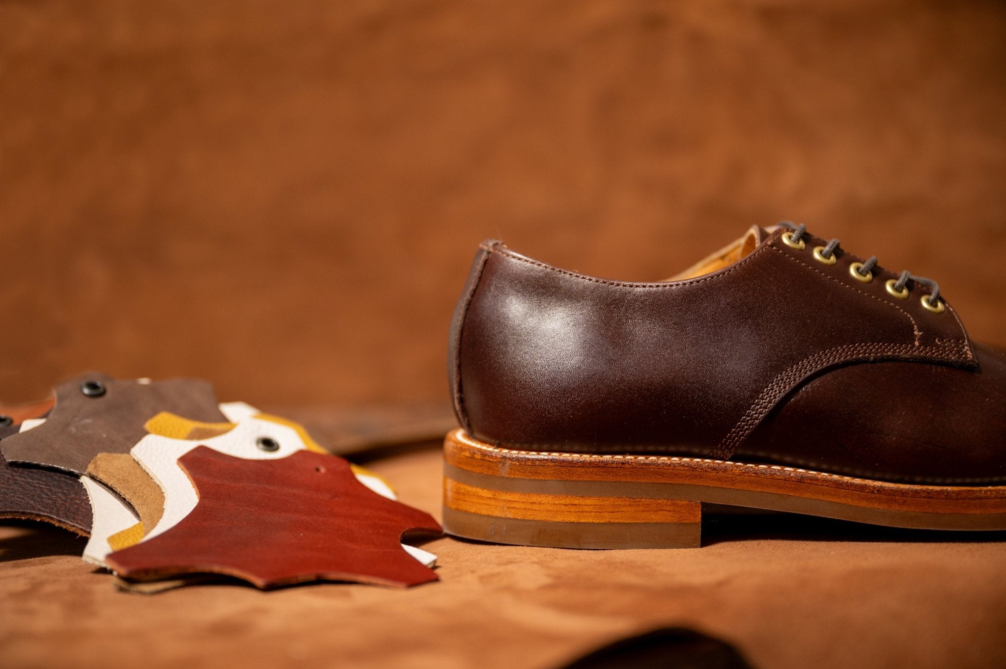 Classic Derby shoes featuring a unique Brown-colored upper in handsome pull-up leather, complemented by a veggie-tanned leather insole and Itshide studded Camel sole. Each pair is meticulously crafted over thirty days, with more than 200 individual steps, making these shoes a truly exceptional and one-of-a-kind creation