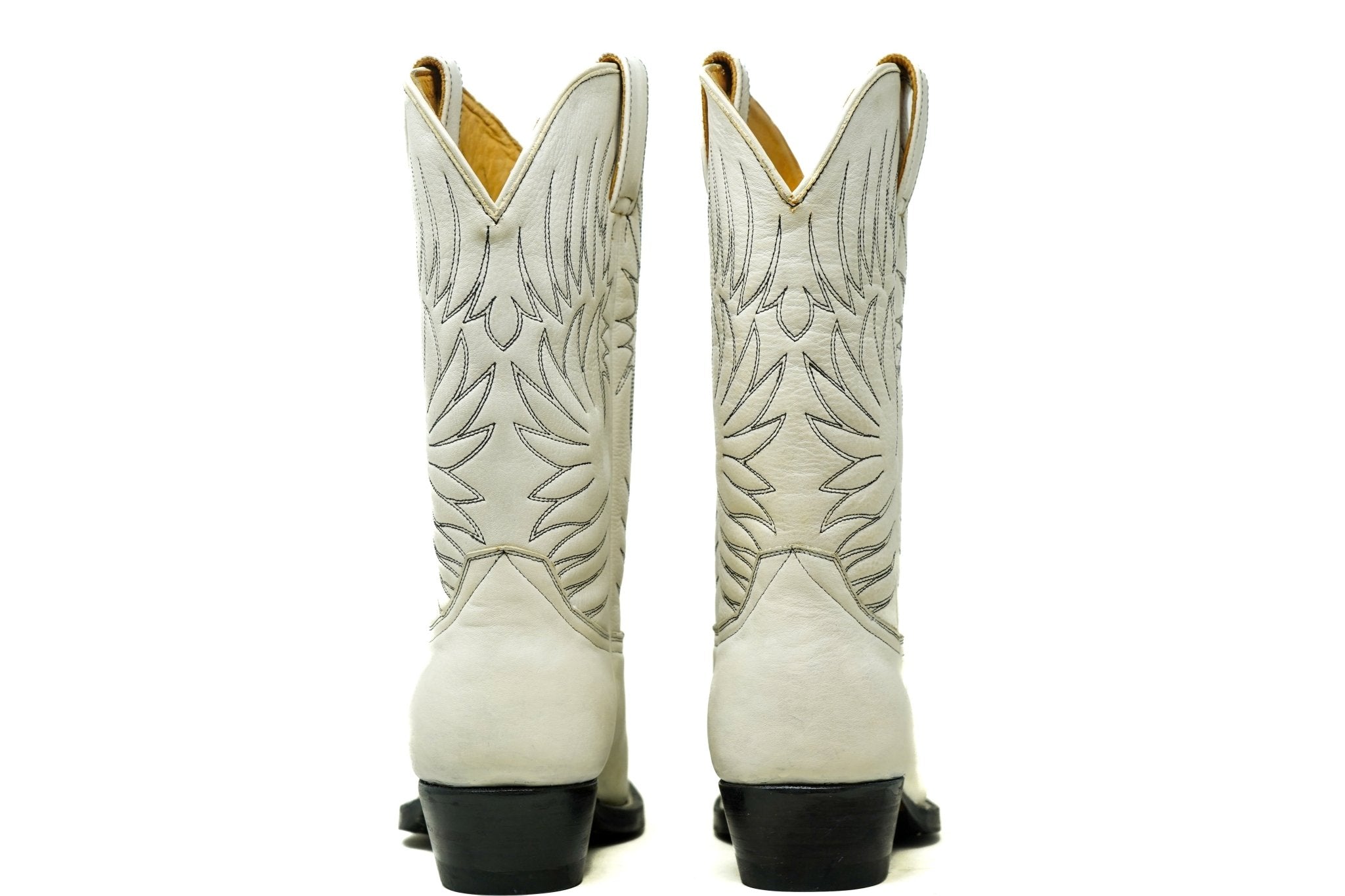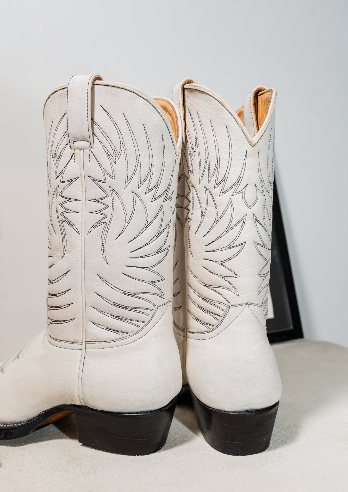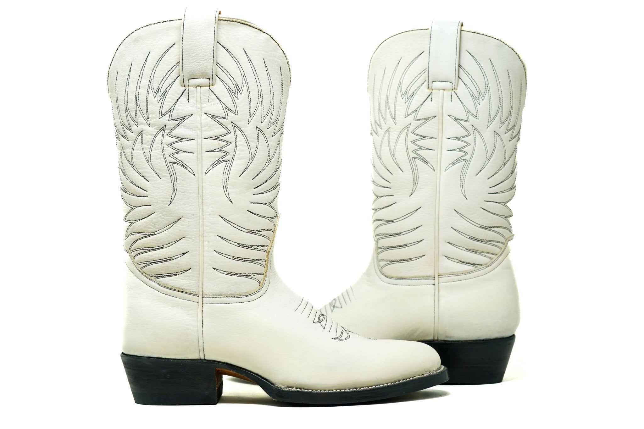 Step up your look with these sleek Western boots, crafted from premium white leather for a refined yet rugged appeal. The shaft features intricate tonal embroidery, adding a touch of traditional cowboy craftsmanship. Designed with a slightly pointed toe, a sturdy black heel, and a durable Goodyear-welted sole, these boots blend timeless design with modern durability. Whether dressing up or down, these boots make a bold statement while ensuring all-day comfort.