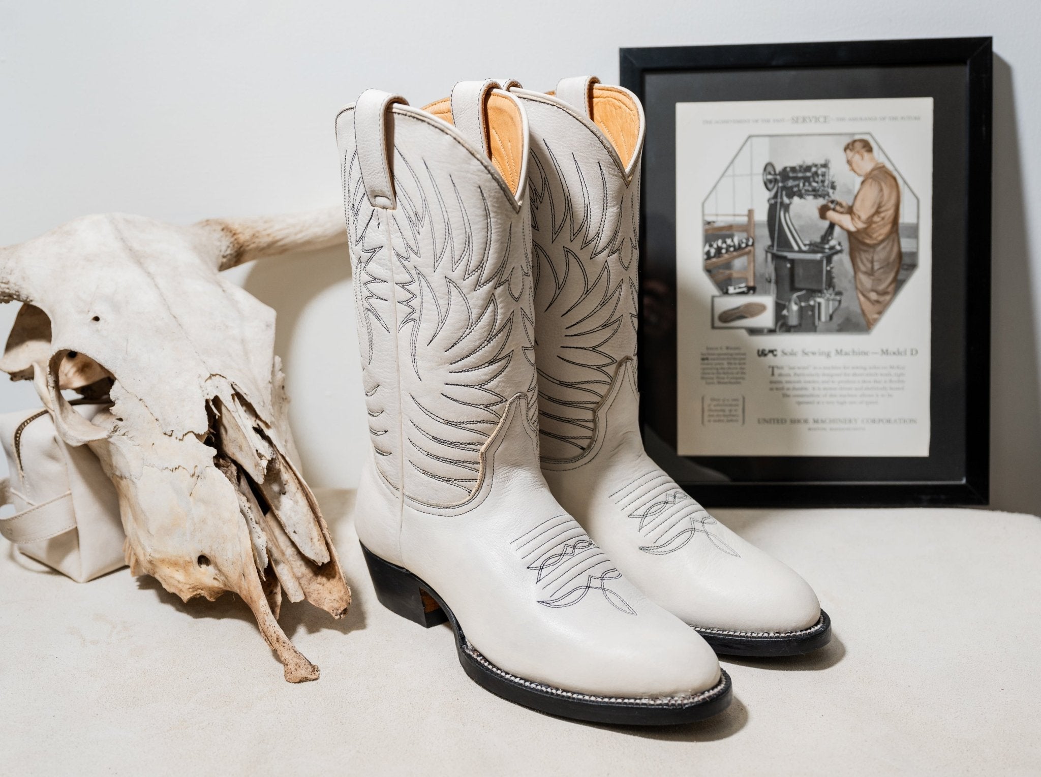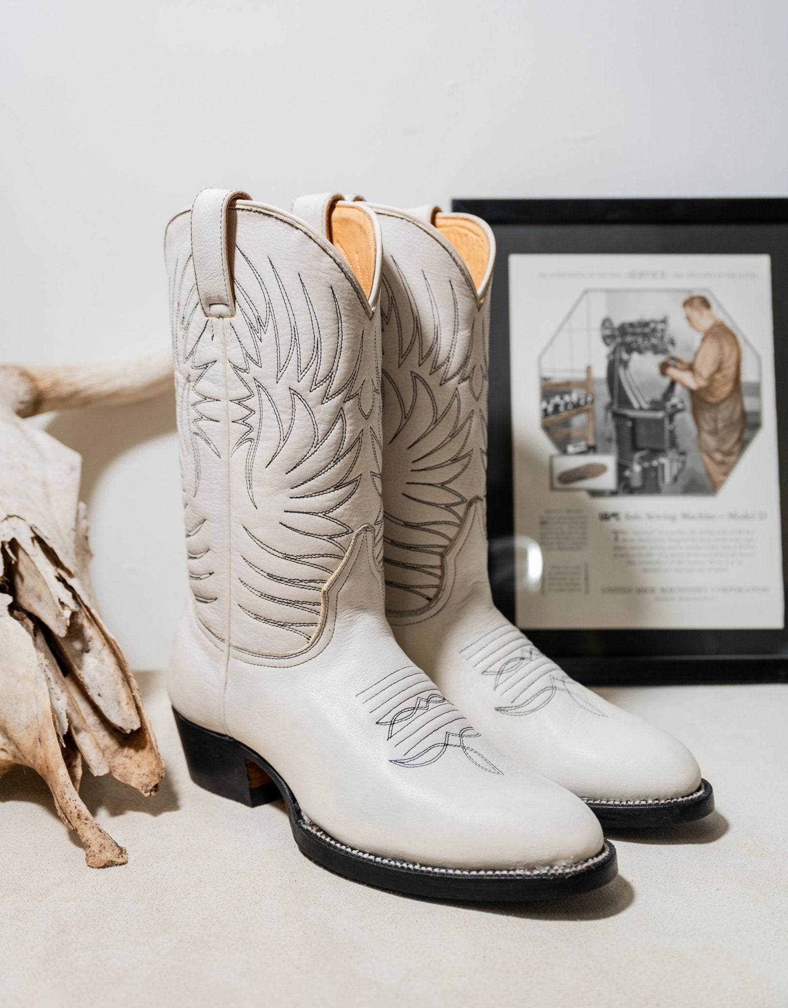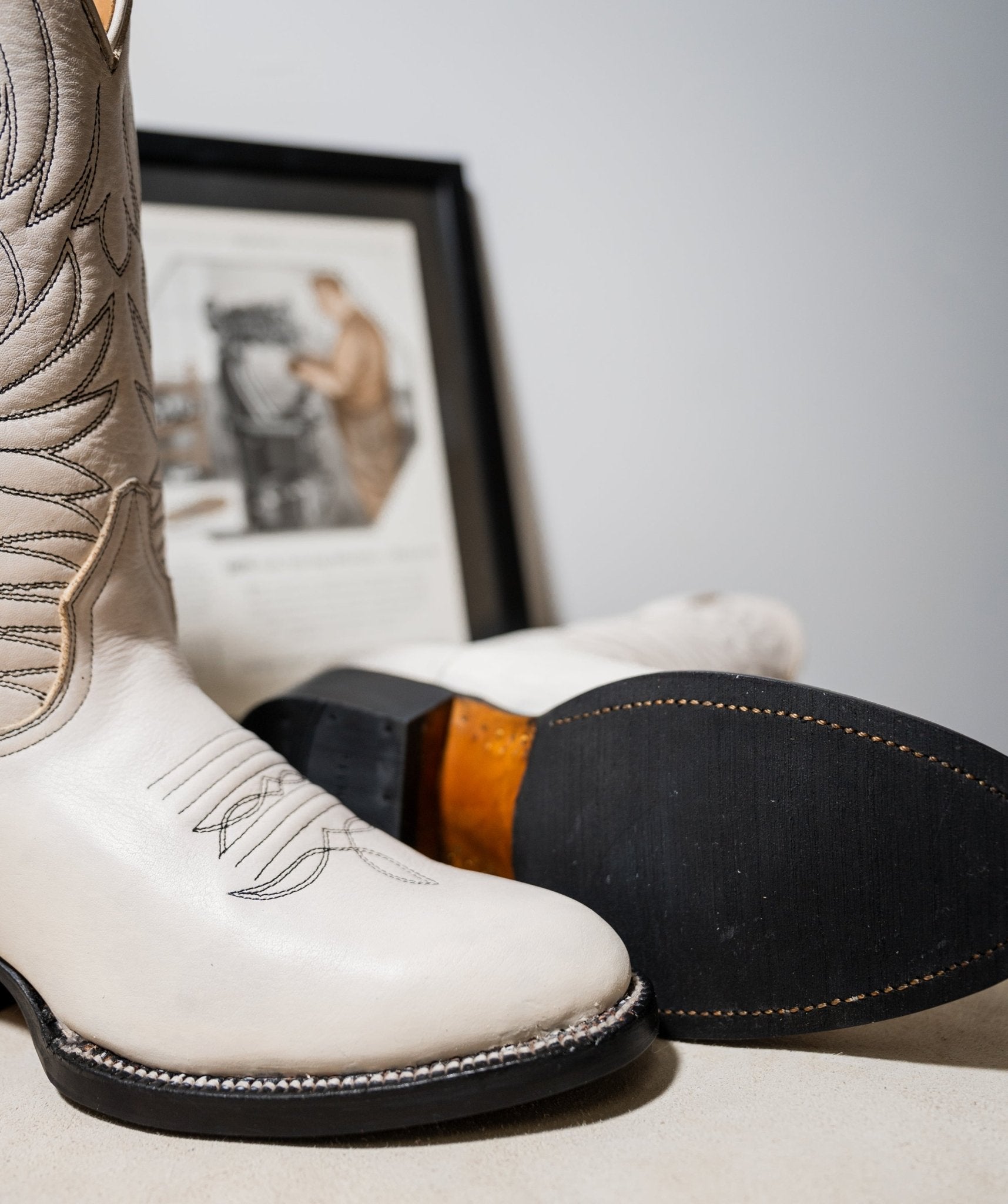 Step up your look with these sleek Western boots, crafted from premium white leather for a refined yet rugged appeal. The shaft features intricate tonal embroidery, adding a touch of traditional cowboy craftsmanship. Designed with a slightly pointed toe, a sturdy black heel, and a durable Goodyear-welted sole, these boots blend timeless design with modern durability. Whether dressing up or down, these boots make a bold statement while ensuring all-day comfort.