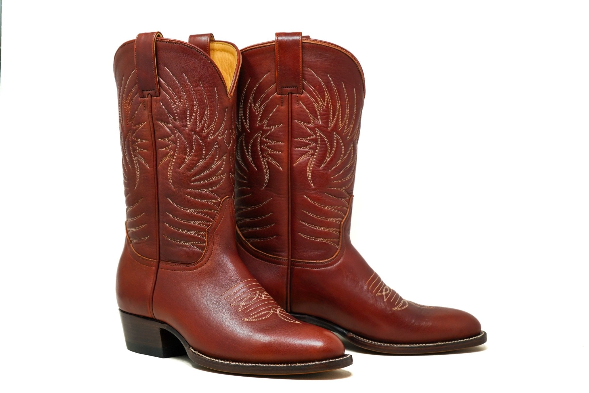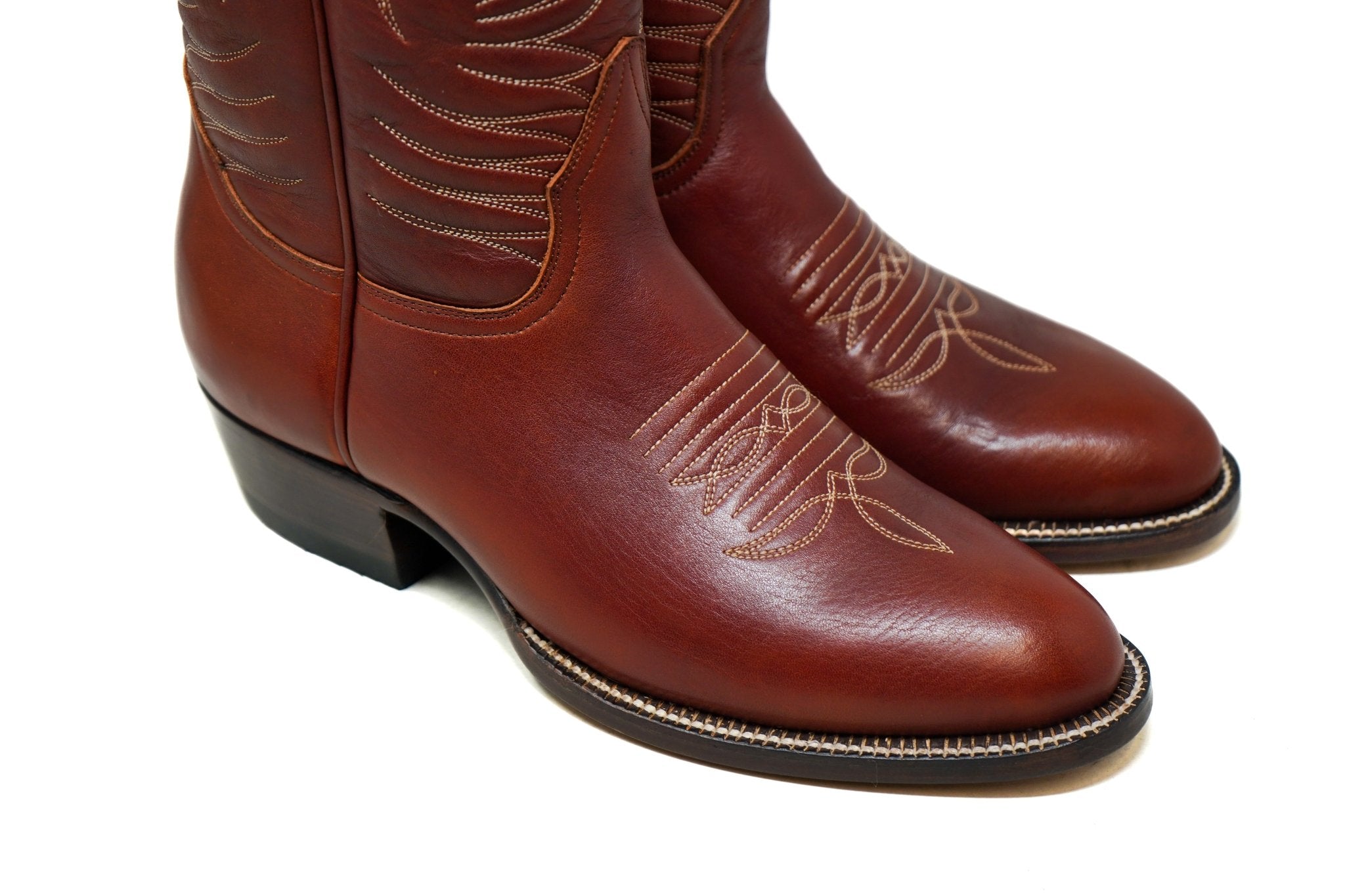 Made from rich Shedron leather, they feature handmade decorative stitching along the shaft, a clean, classic silhouette, and a stacked leather cowboy heel that balances durability with timeless style.