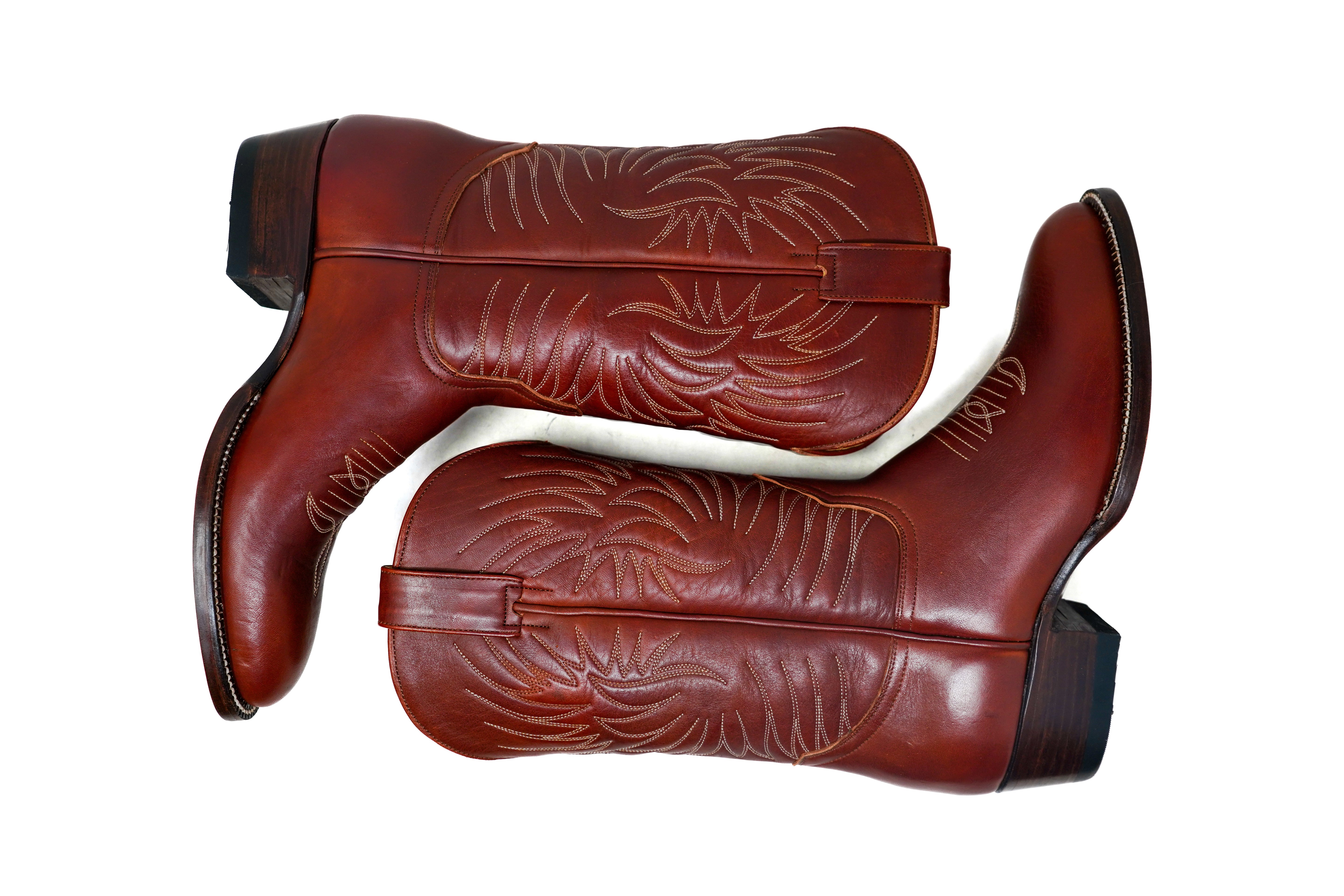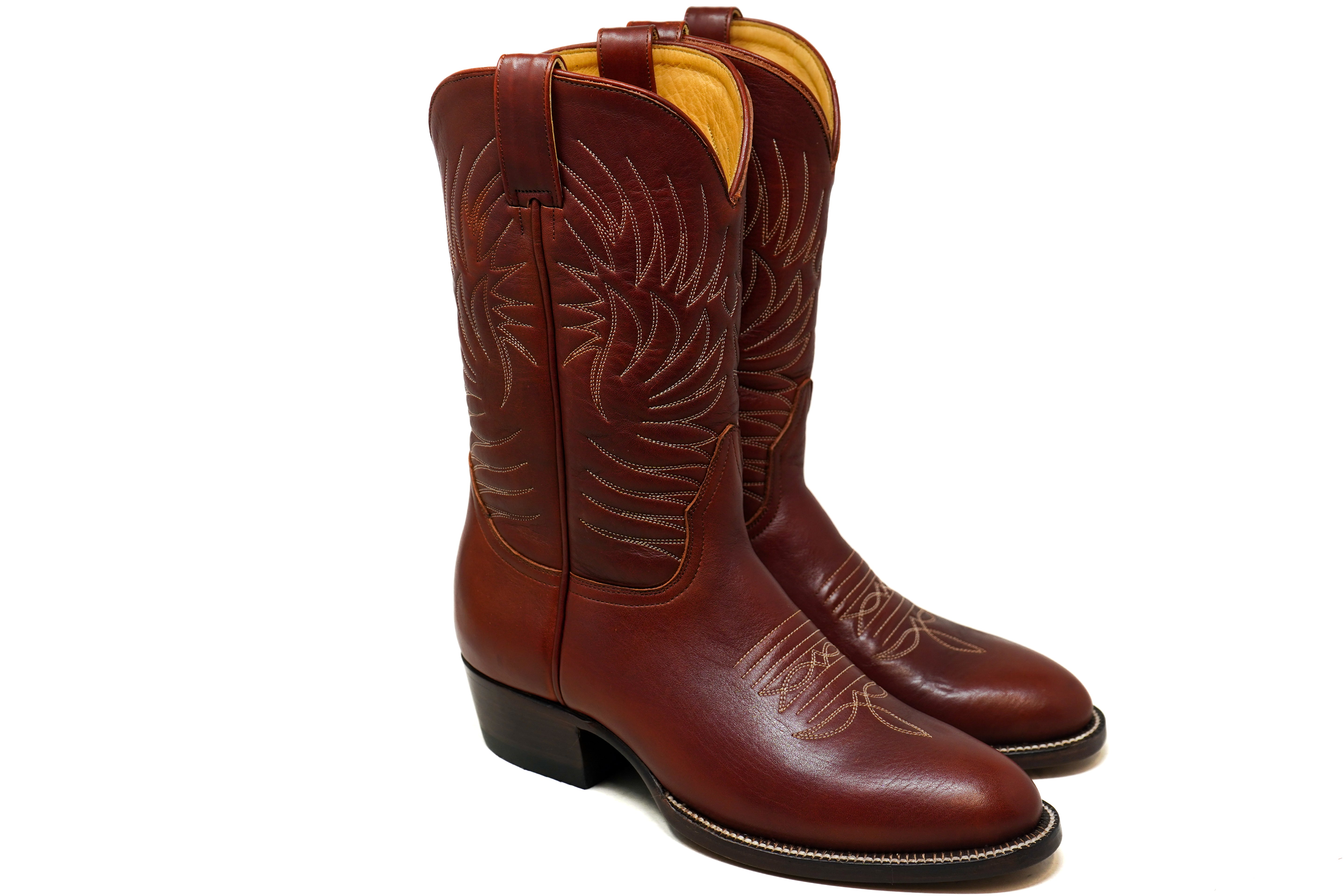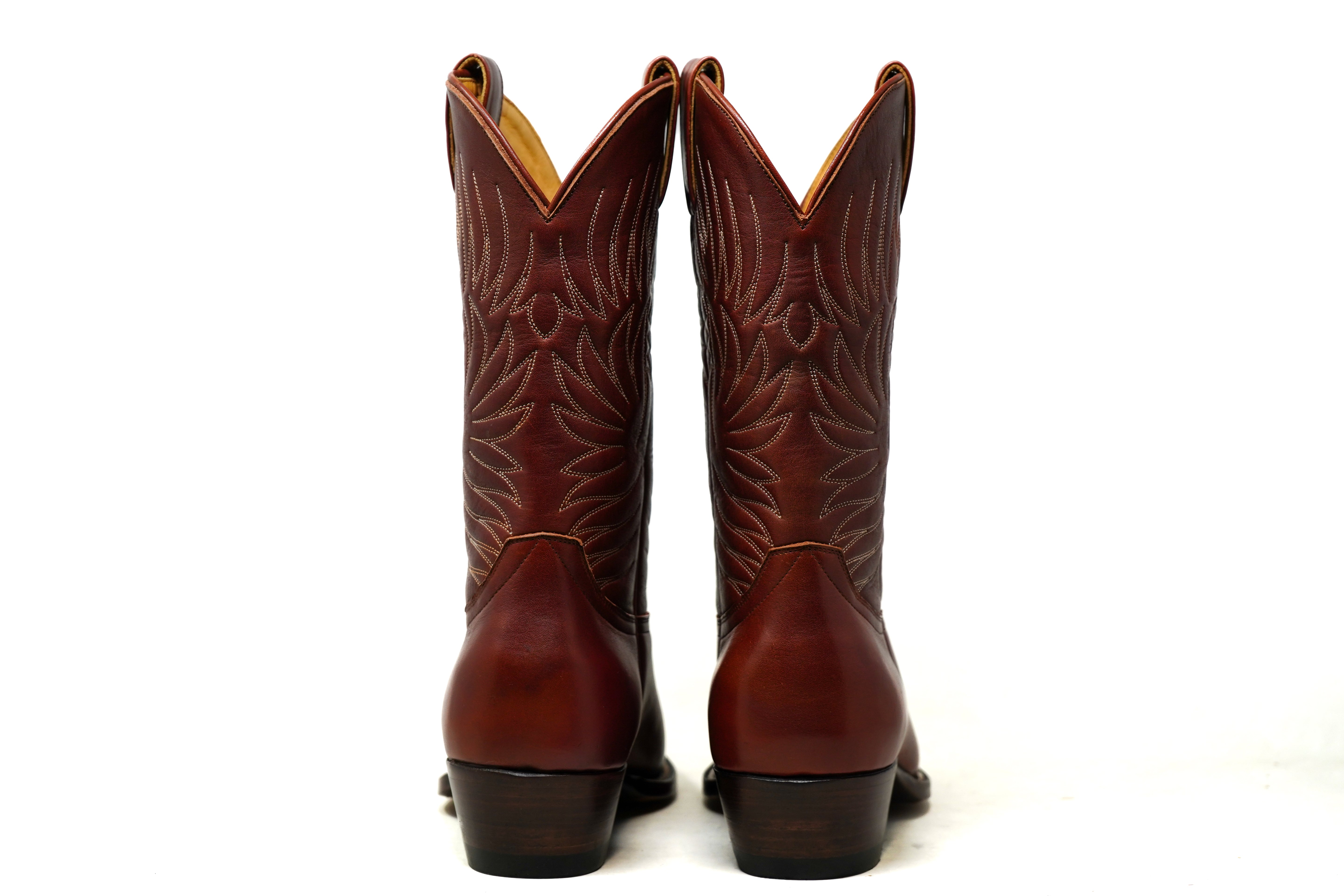 Made from rich Shedron leather, they feature handmade decorative stitching along the shaft, a clean, classic silhouette, and a stacked leather cowboy heel that balances durability with timeless style.