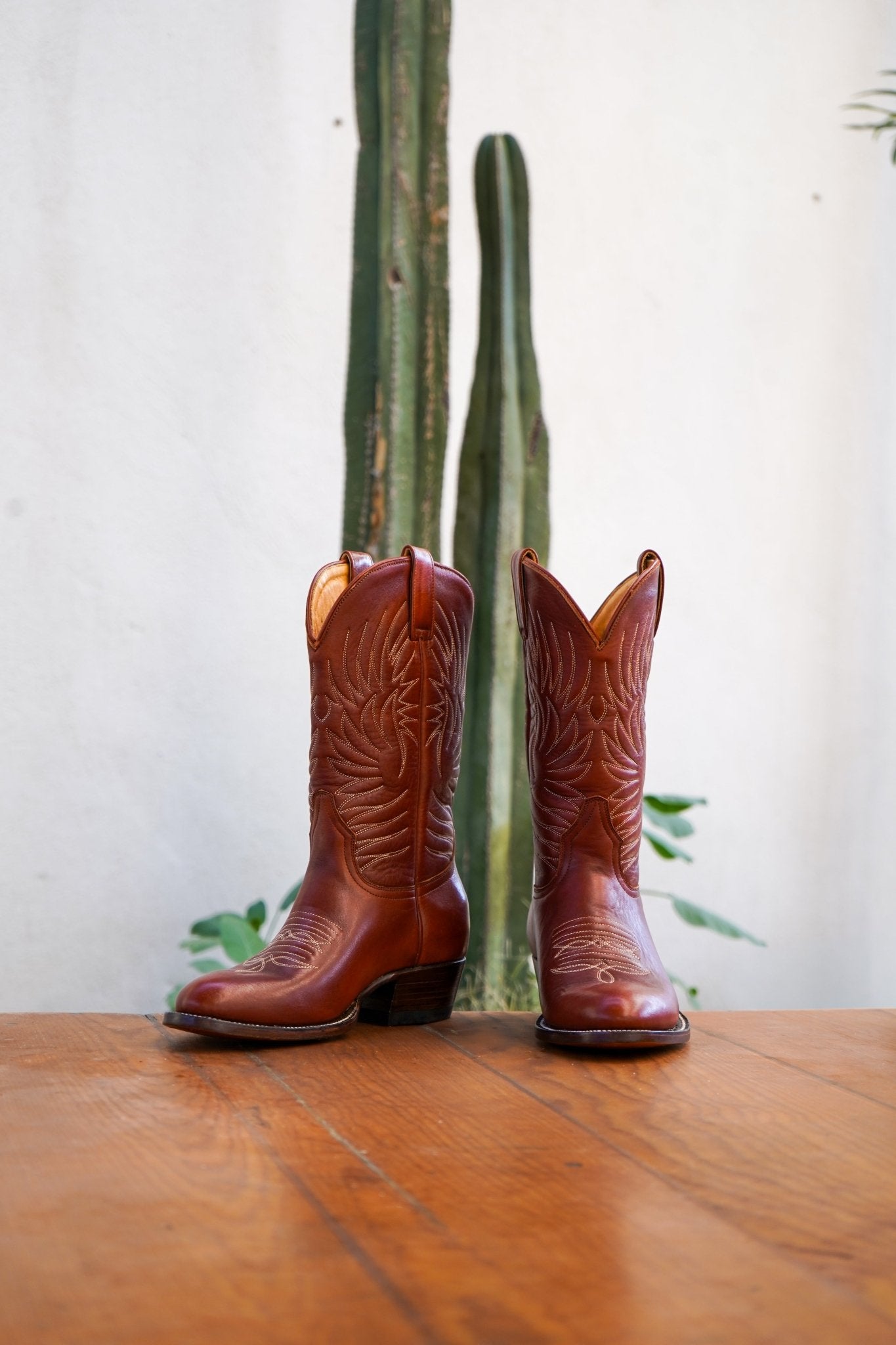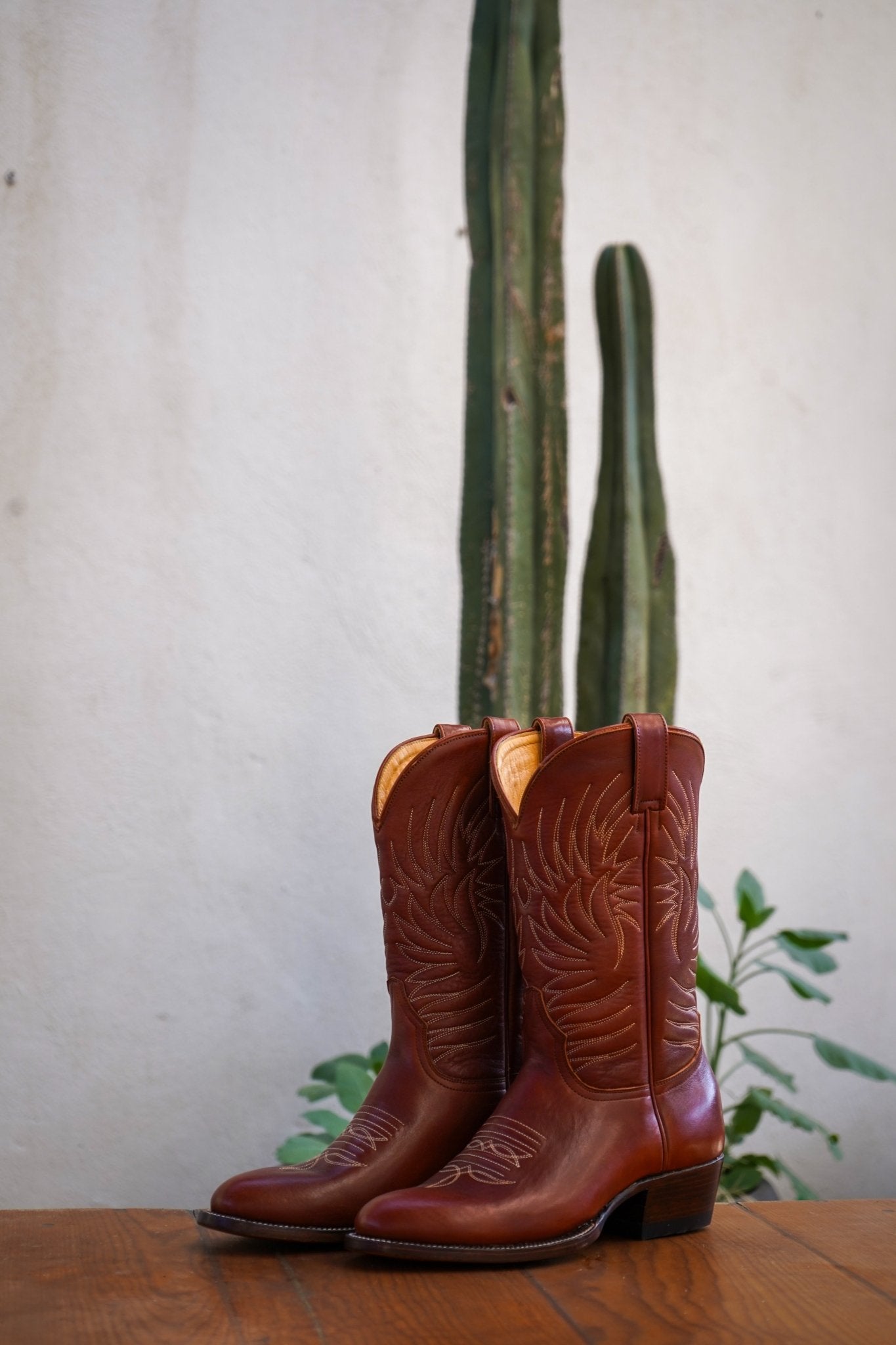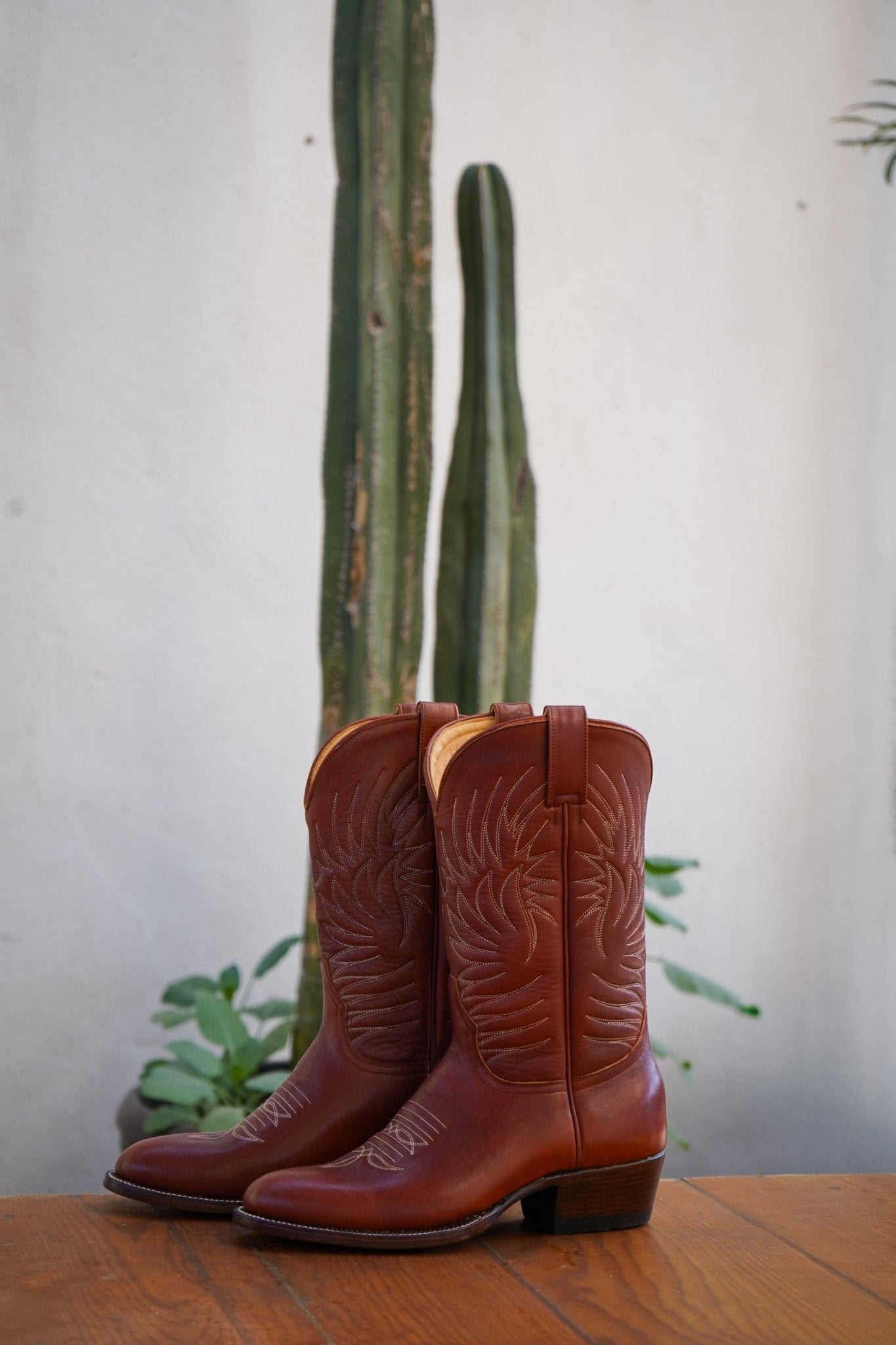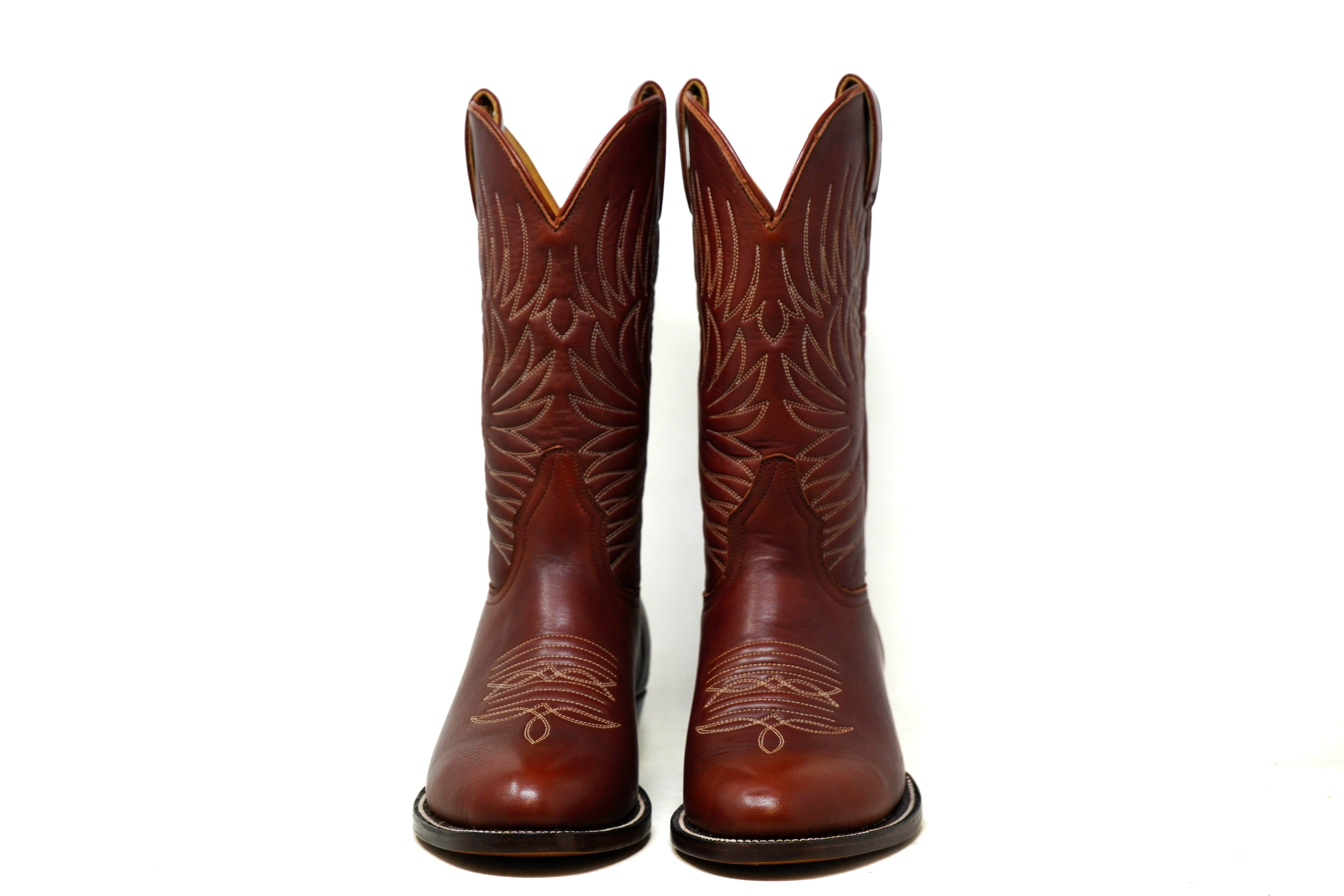 Made from rich Shedron leather, they feature handmade decorative stitching along the shaft, a clean, classic silhouette, and a stacked leather cowboy heel that balances durability with timeless style.