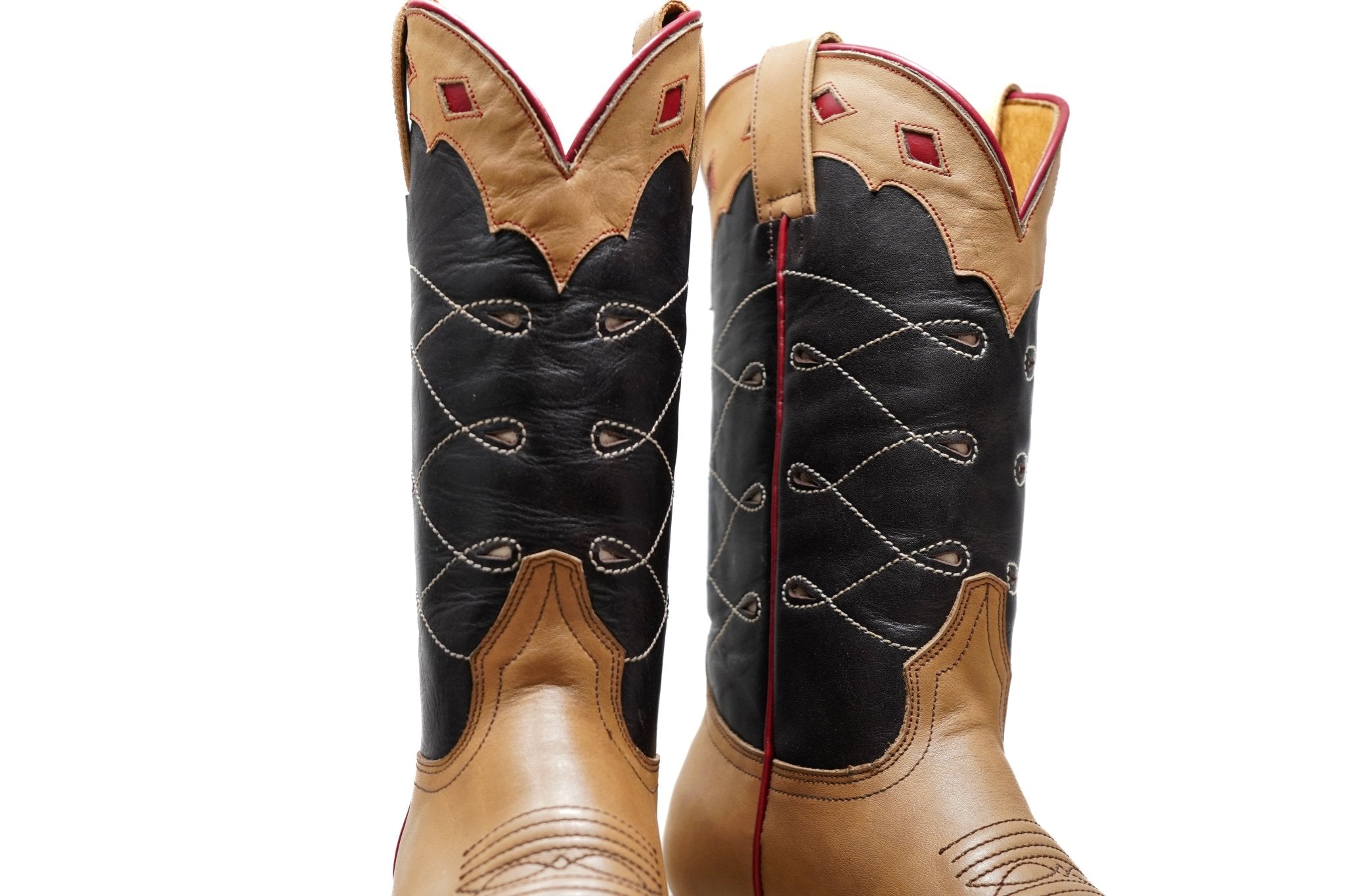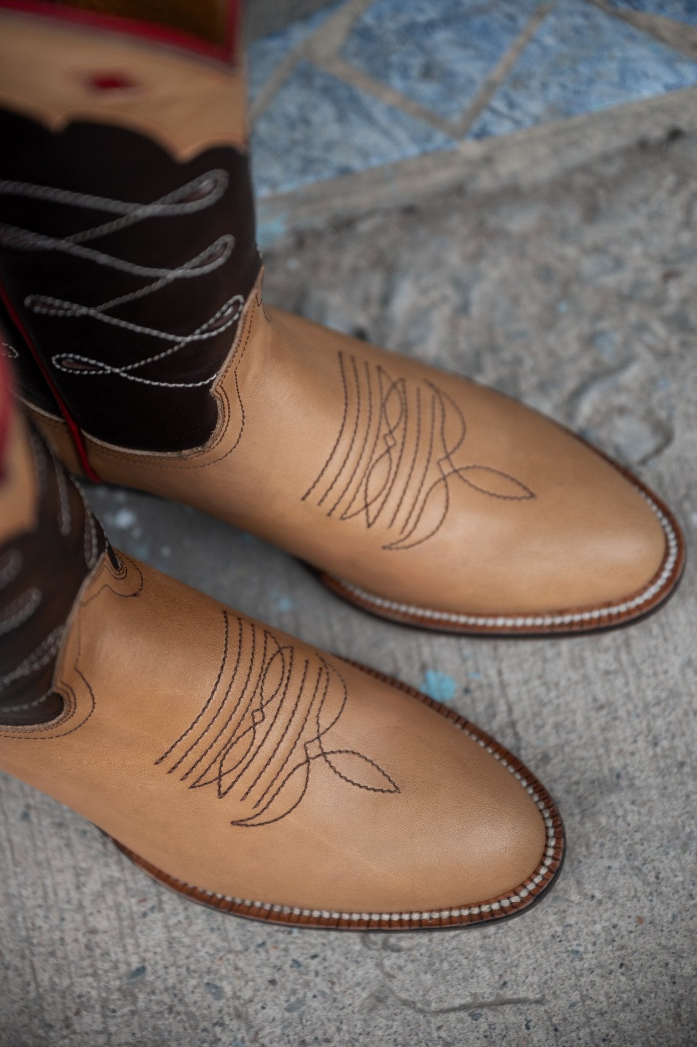 Crafted from premium calf leather with a supple lining, these handcrafted western boots combine tradition and durability. Built on the Pintoe last (double E width) for a comfortable fit, they feature a 120-degree mini welt construction with a brass-nailed and wooden-pegged waist for lasting resilience. The vegetable-tanned leather outsole and insole, reinforced with a leather heel counter and toe stiffener, ensure structure and support. Handmade Punto Marcado detailing adds an artisanal touch, while hand-forged penny nails enhance durability. With a bold two-tone design and intricate stitching, these boots are a refined expression of western craftsmanship.