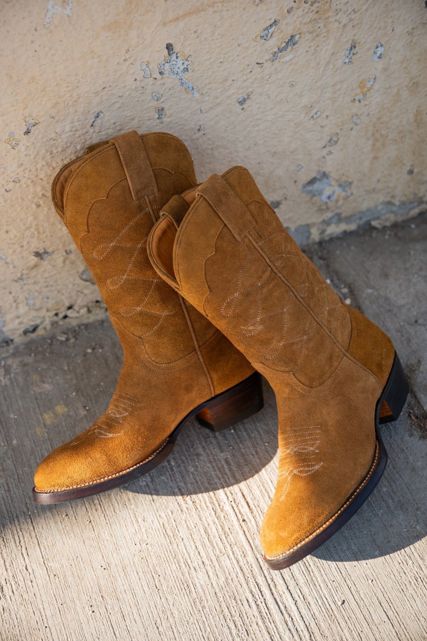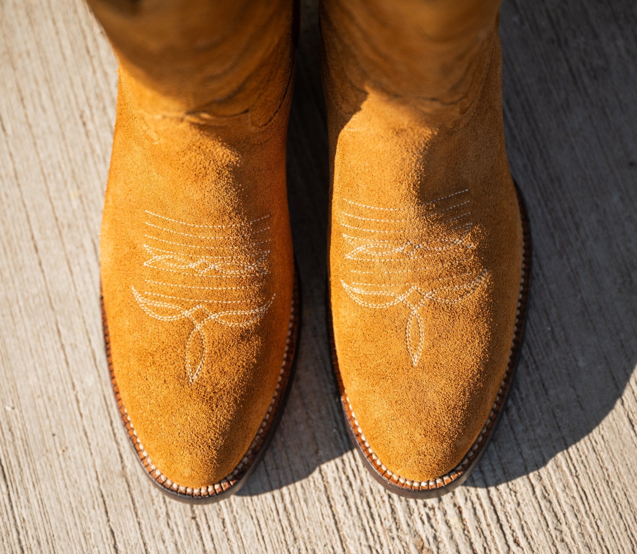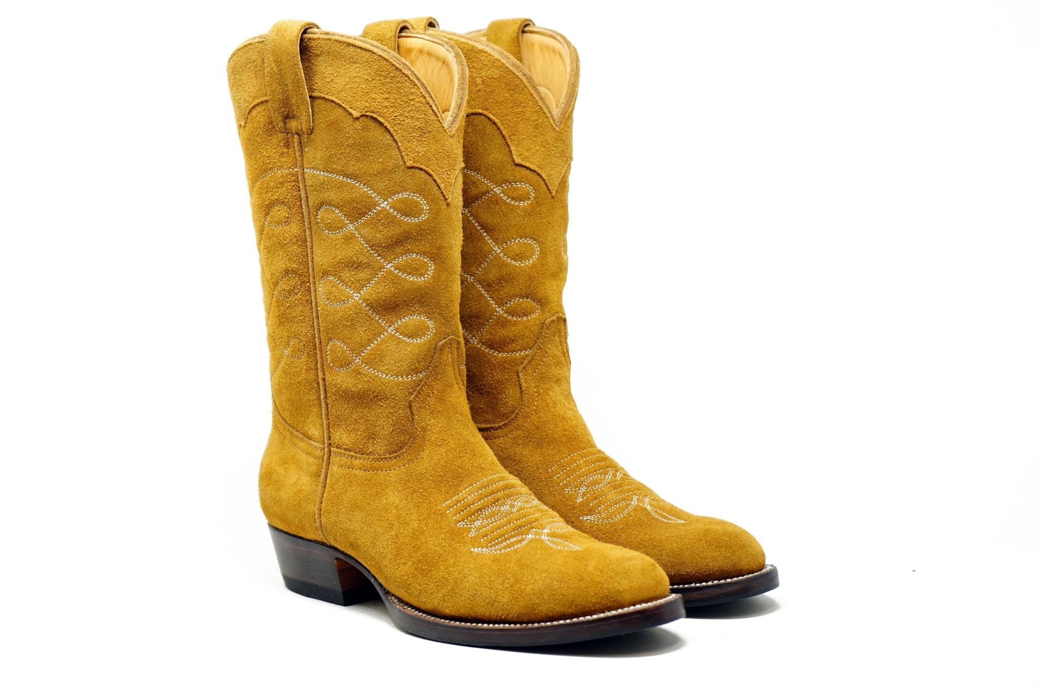 A timeless Western silhouette reimagined in rich golden suede. These Durango boots feature classic embroidery on the shaft, a comfortable round toe, and a sturdy half rubber sole built for durability and grip. The supple suede not only adds texture and depth but also makes them versatile enough to style from ranch to city streets. Handcrafted with traditional techniques, they deliver everyday comfort while staying true to authentic cowboy heritage.