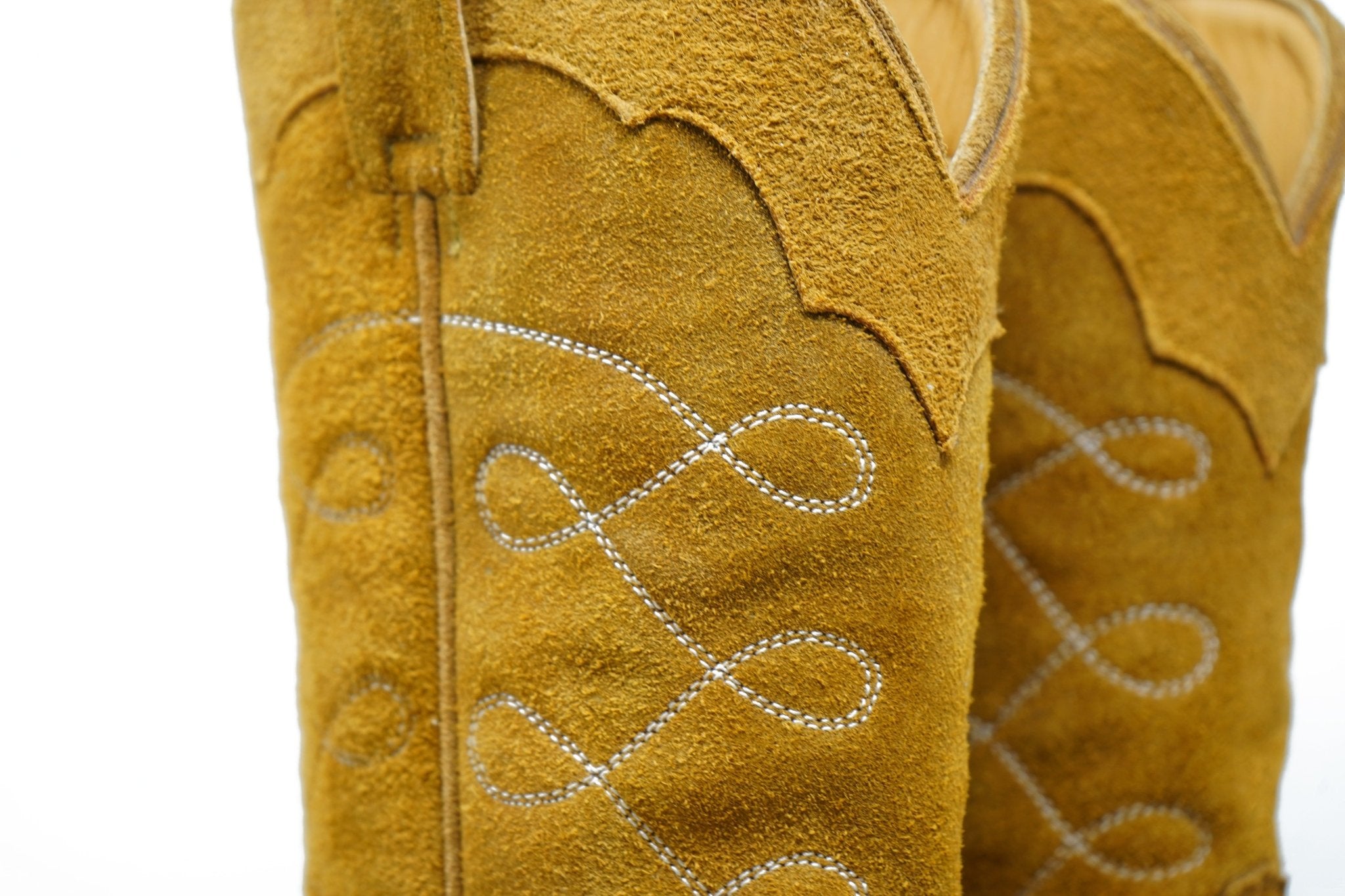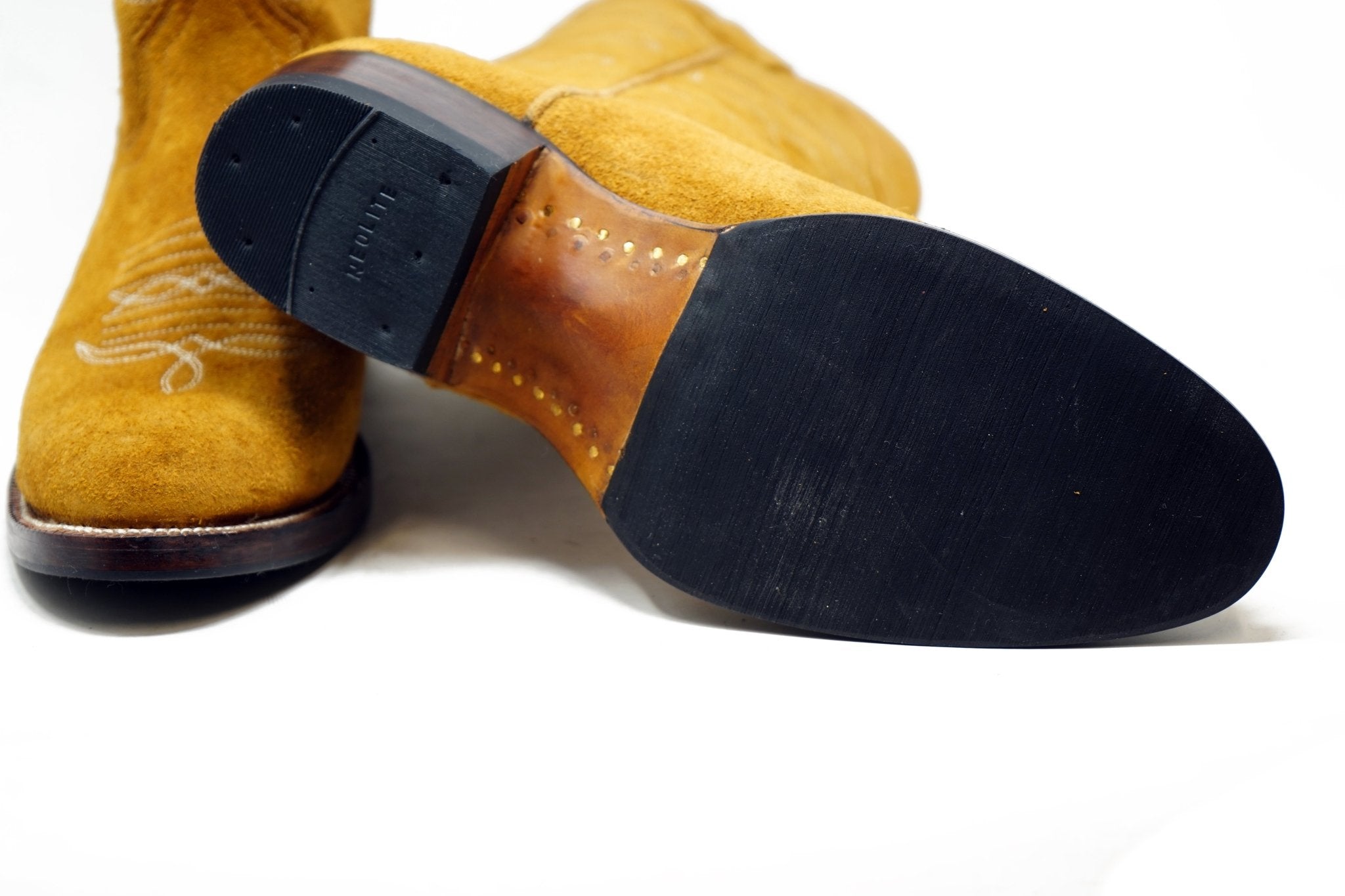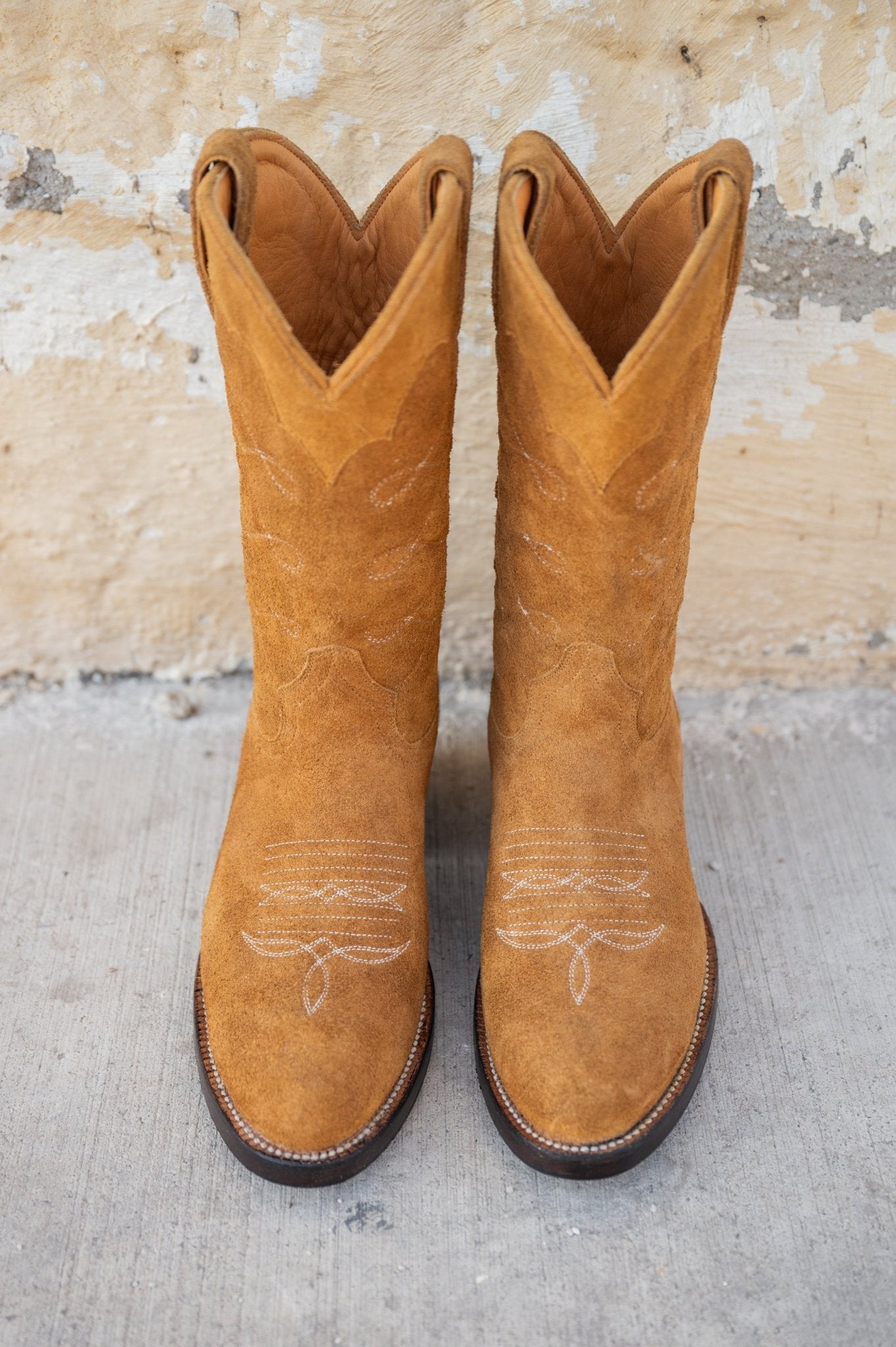 A timeless Western silhouette reimagined in rich golden suede. These Durango boots feature classic embroidery on the shaft, a comfortable round toe, and a sturdy half rubber sole built for durability and grip. The supple suede not only adds texture and depth but also makes them versatile enough to style from ranch to city streets. Handcrafted with traditional techniques, they deliver everyday comfort while staying true to authentic cowboy heritage.