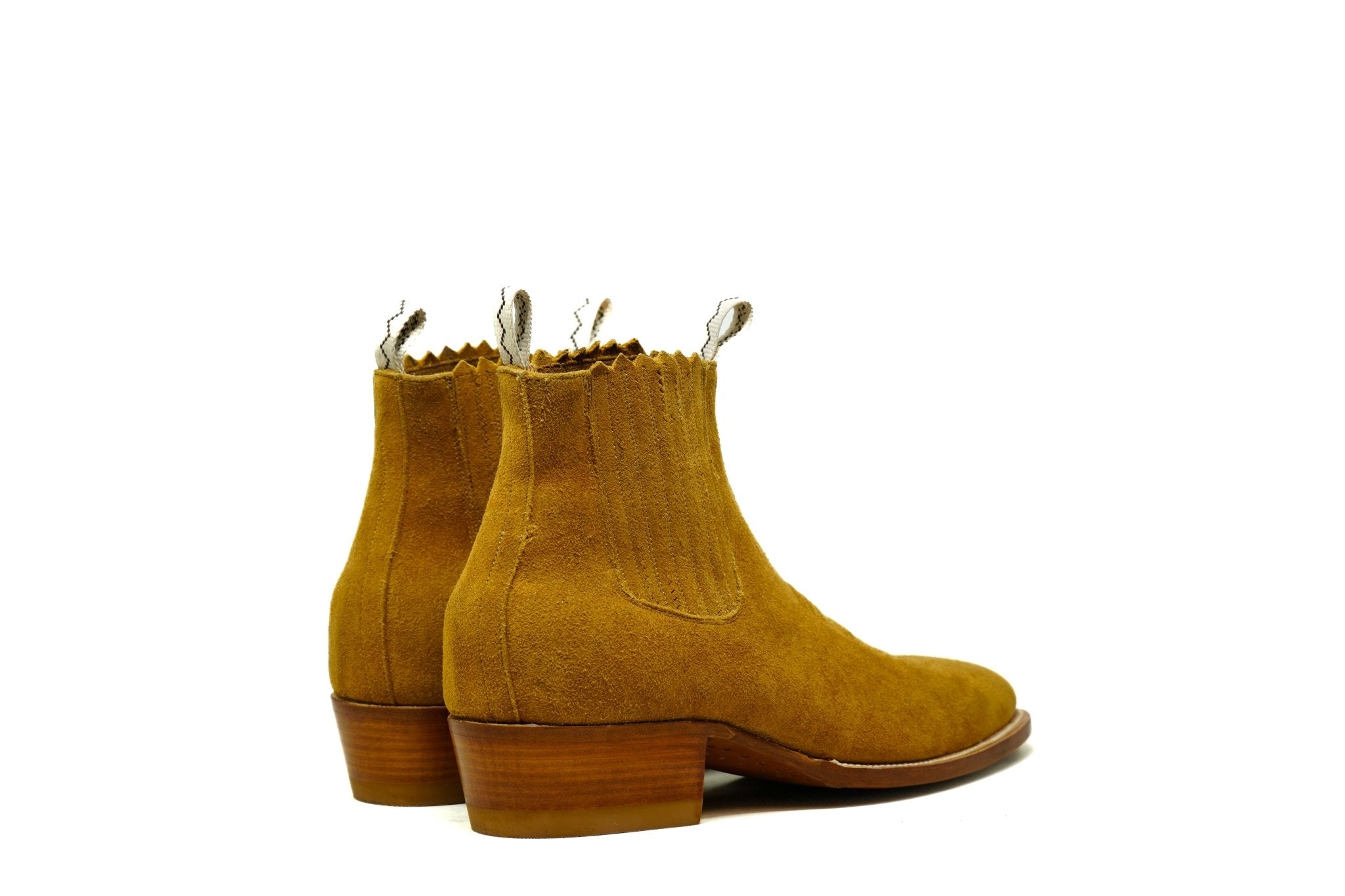 Crafted from richly suede leather, this refined ankle boot features distinctive multicolor toe-bug stitching and handmade punto marcado detailing that highlight its artisanal Western character. Built on the sleek pointy last (D width) with calf leather lining and insole, leather outsole, and a traditional 120° mini-welt secured by brass nails and a wooden-pegged waist, it offers durability, structure, and timeless elegance.