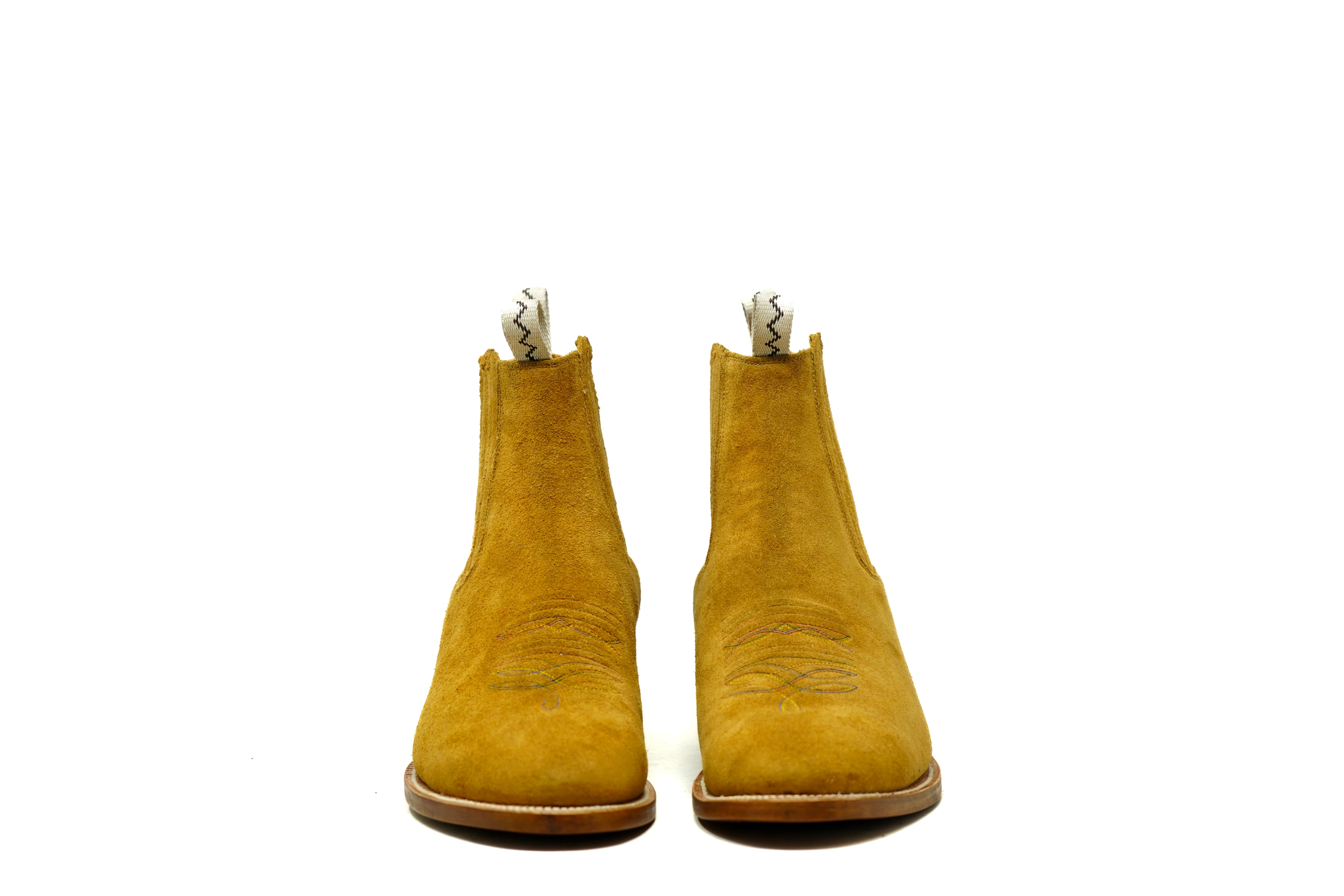 Crafted from richly suede leather, this refined ankle boot features distinctive multicolor toe-bug stitching and handmade punto marcado detailing that highlight its artisanal Western character. Built on the sleek pointy last (D width) with calf leather lining and insole, leather outsole, and a traditional 120° mini-welt secured by brass nails and a wooden-pegged waist, it offers durability, structure, and timeless elegance.