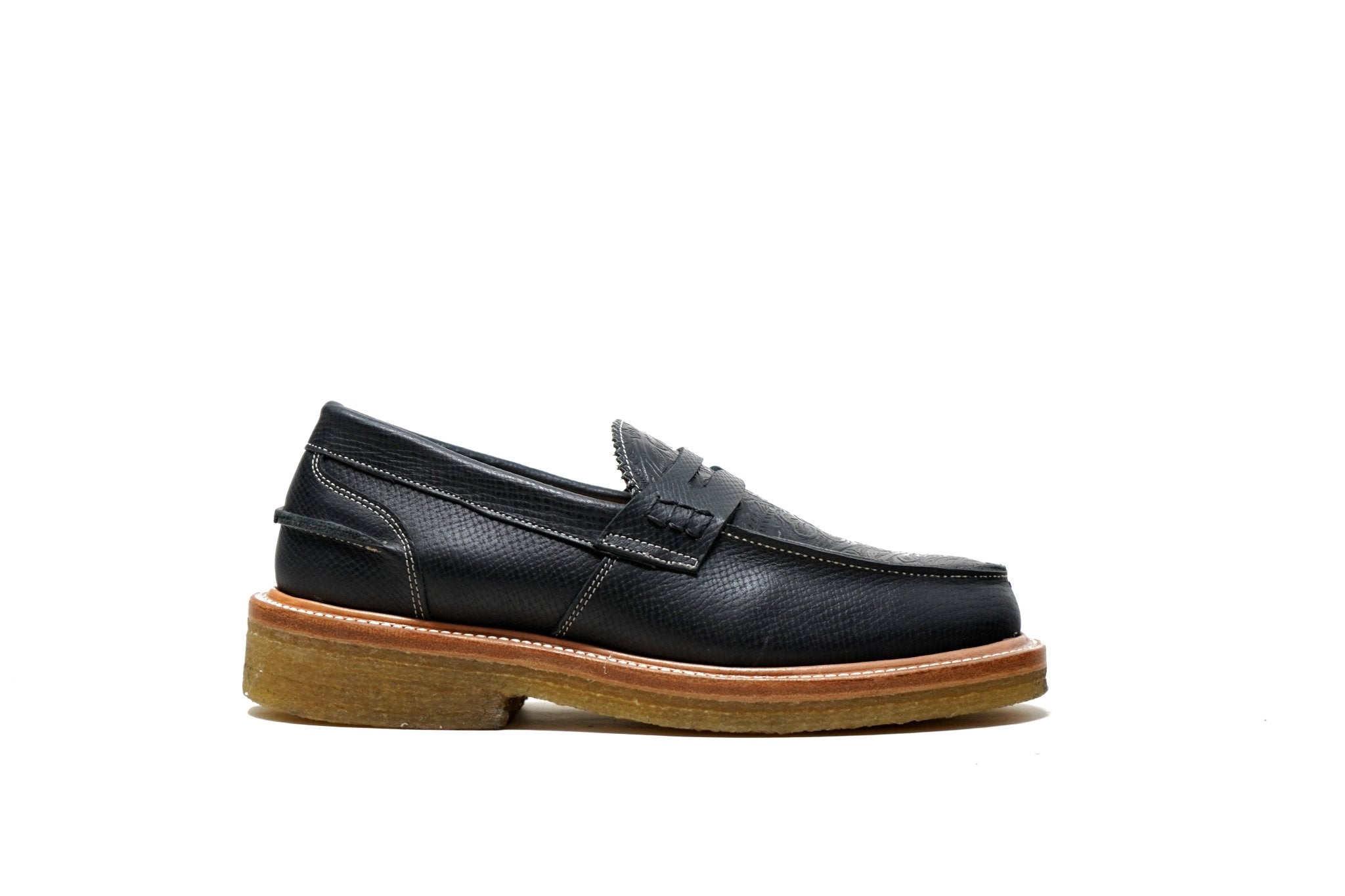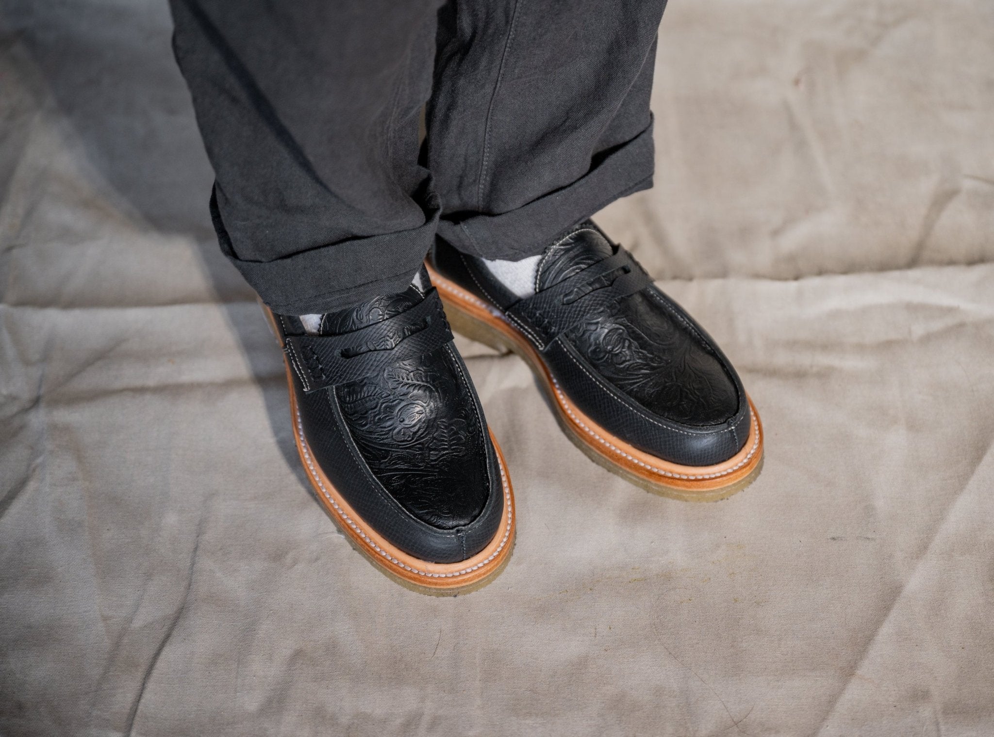 These aren't just loafers; they're a statement. Crafted with a Horween Hatch Grain & Western Floral leather upper, these Goodyear-welted shoes offer a unique blend of rugged charm and classic style. Comfort is key with a supple leather lining, channeled insole, and a natural crepe sole, making them perfect for all-day wear. These loafers are an investment in enduring quality and timeless design, ideal for the modern gentleman who appreciates the finer details.