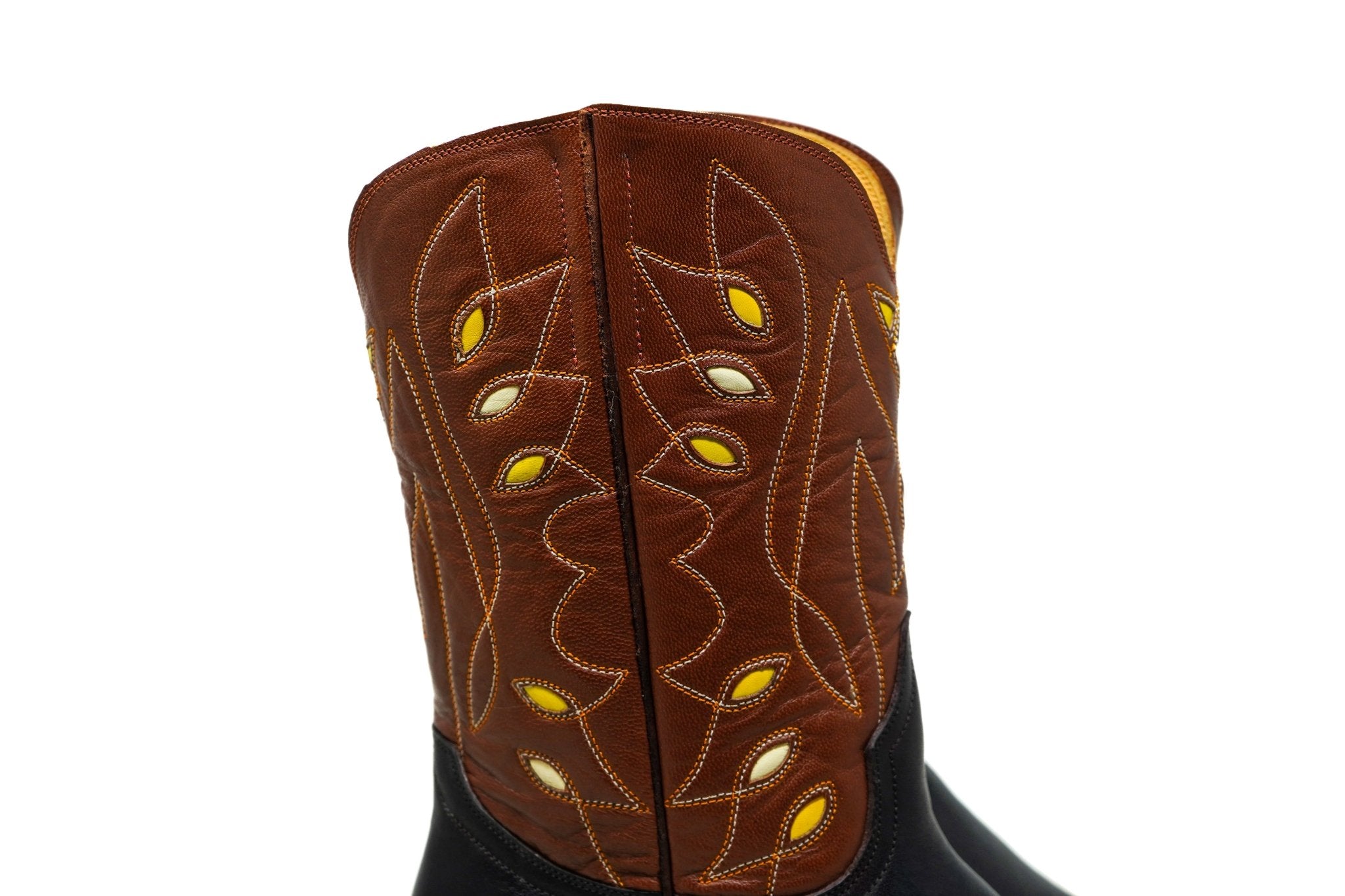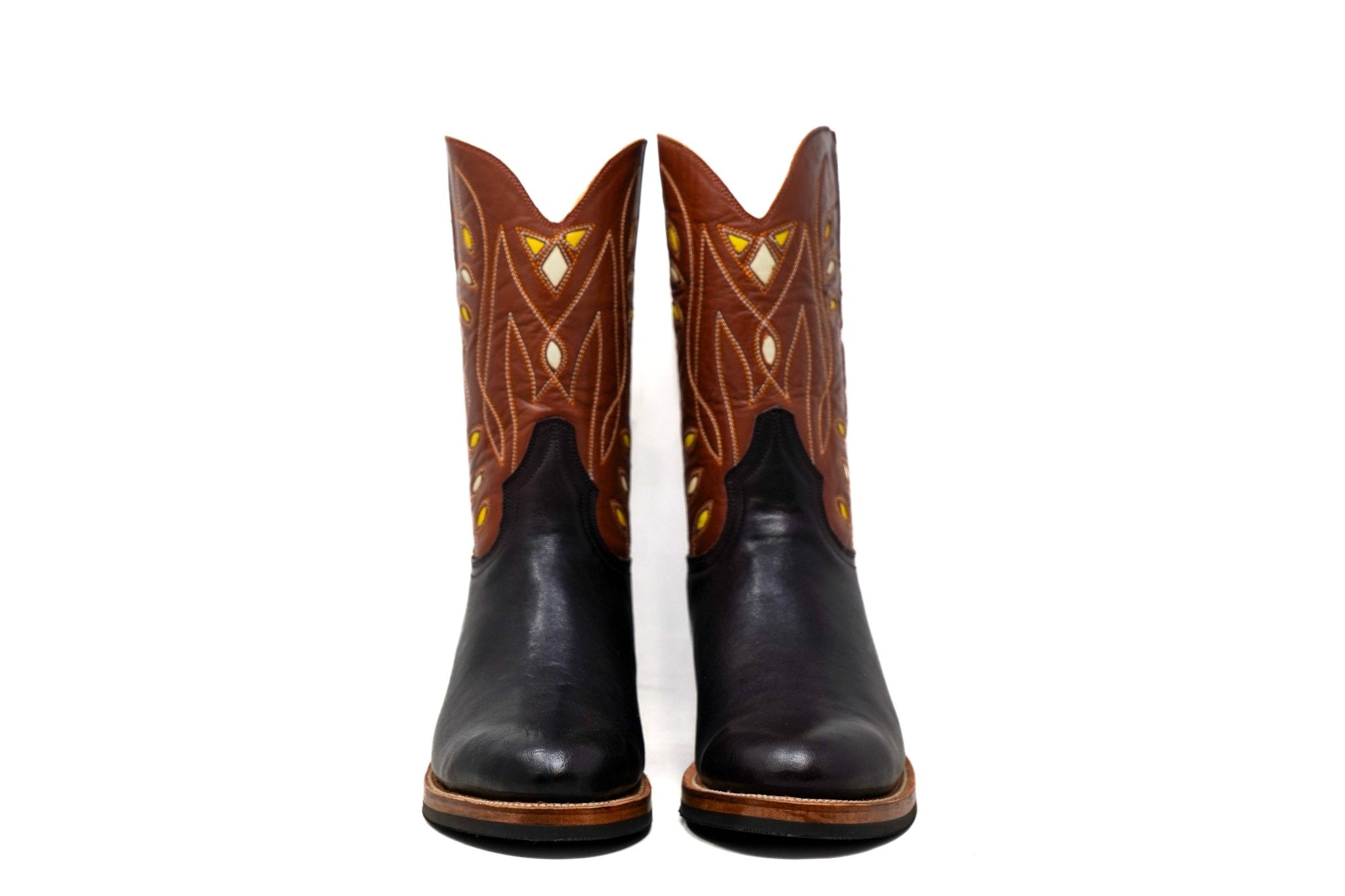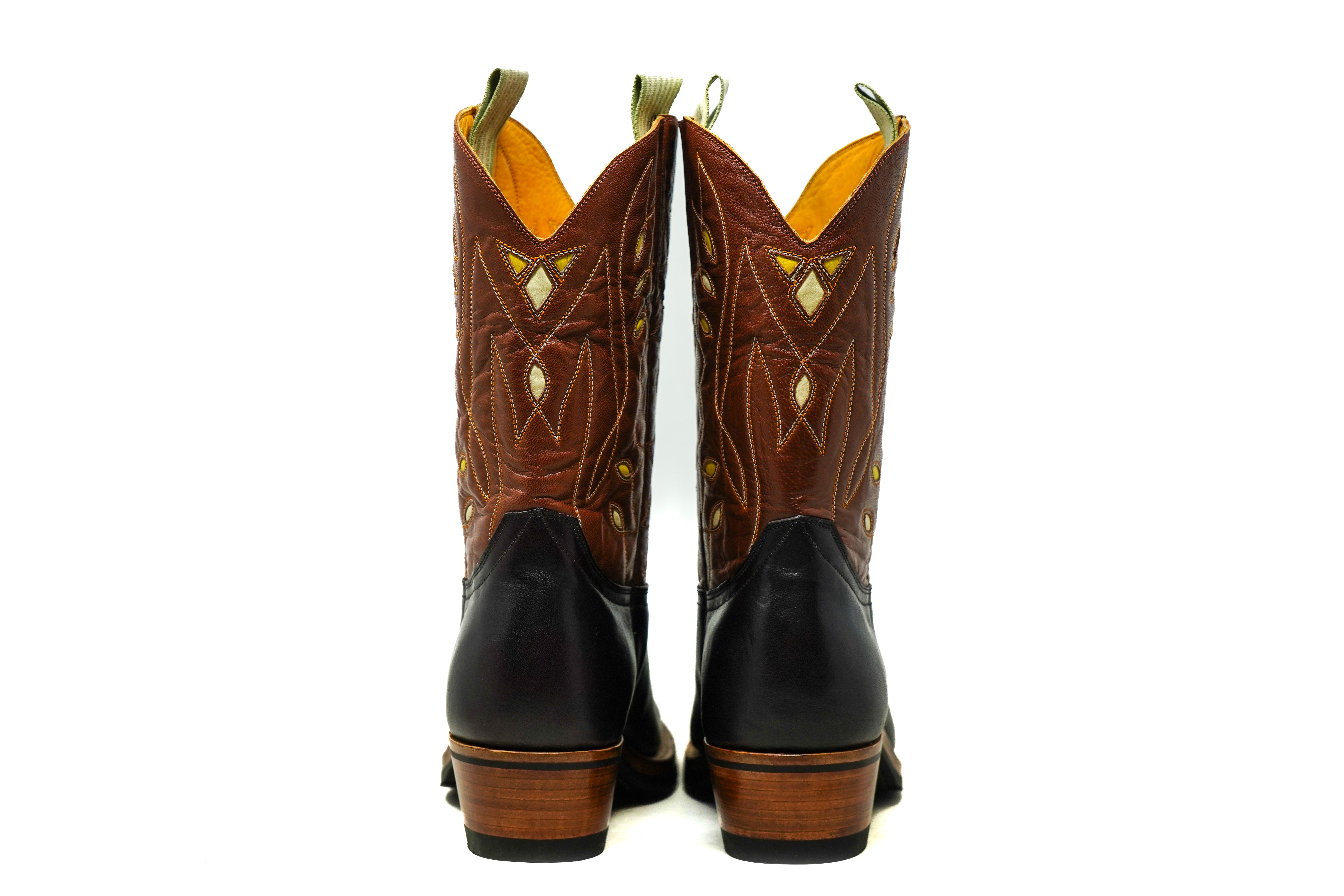 A bold reinterpretation of the classic Western boot, this pair combines dark brown calf leather with richly textured pull-up leather shafts featuring intricate inlays and contrast stitching. The result is a striking balance between traditional craftsmanship and contemporary character.