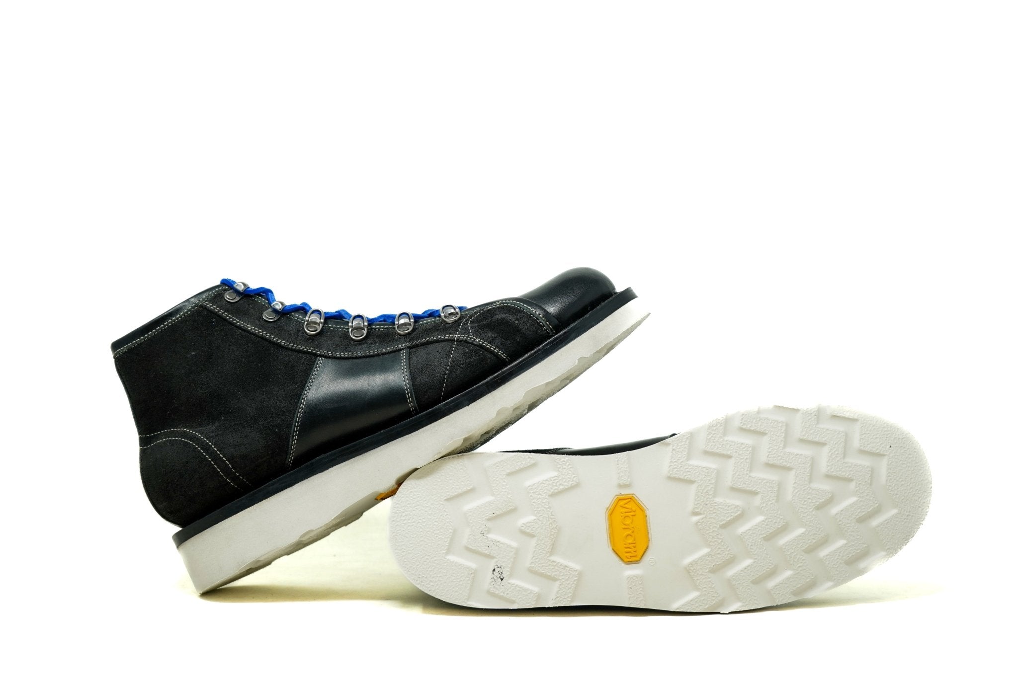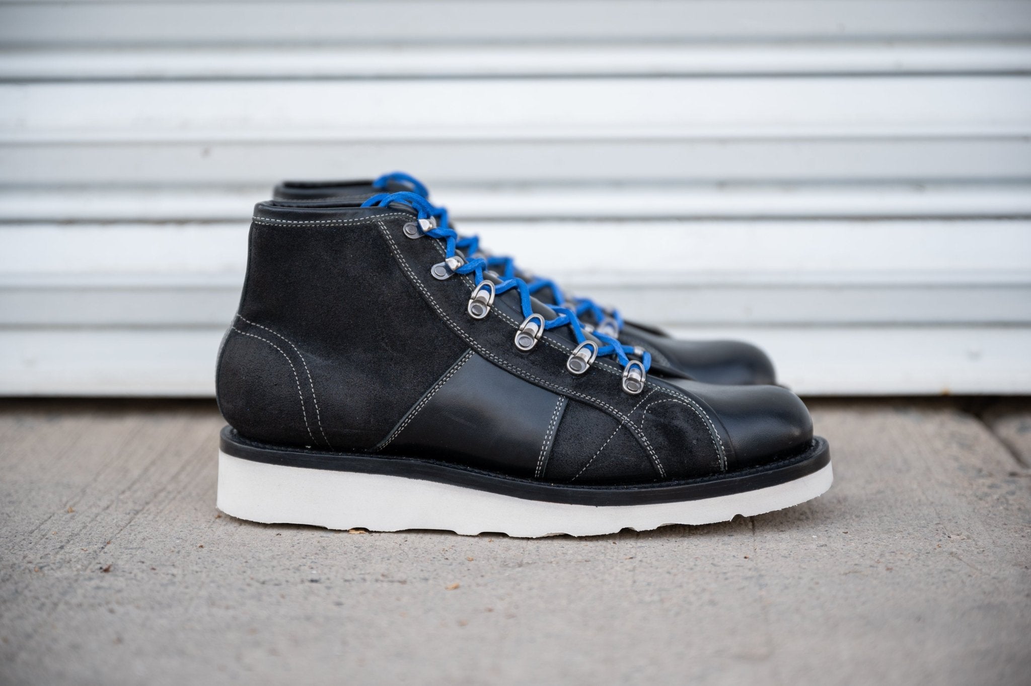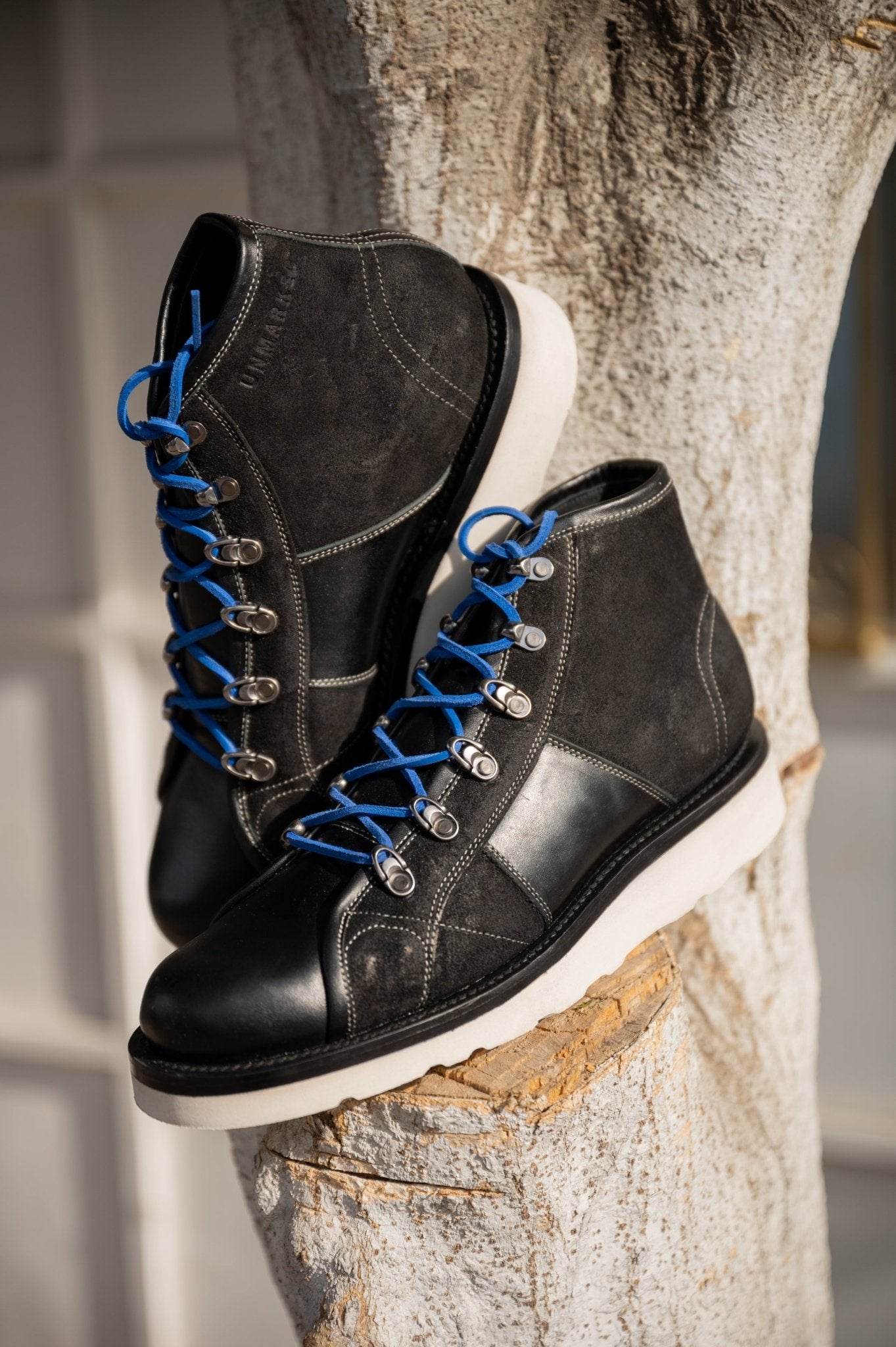 These Unmarked boots blend rugged style with everyday versatility, crafted in olive suede with rich brown pull-up leather accents. Featuring a moc toe design, contrast stitching, and bold yellow hiking laces, they’re set on a lightweight Vibram Christy wedge sole for comfort, grip, and durability. Handcrafted with traditional Goodyear welt construction, they’re built to last while delivering a standout look from city streets to outdoor adventures.