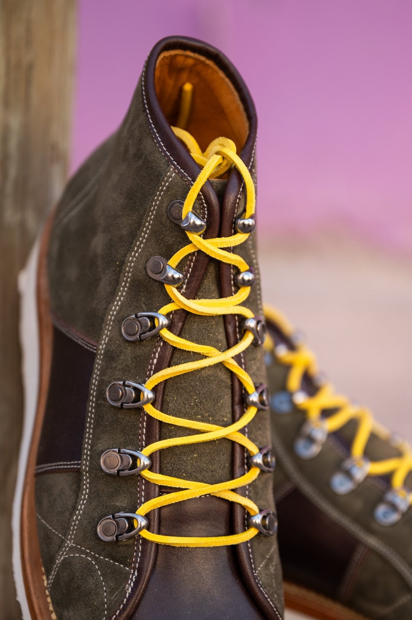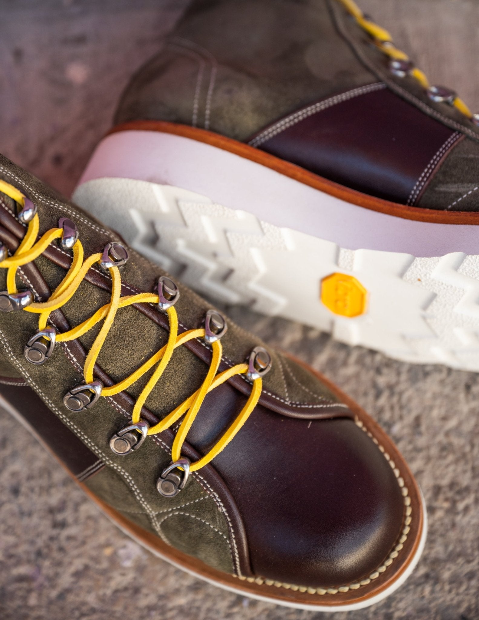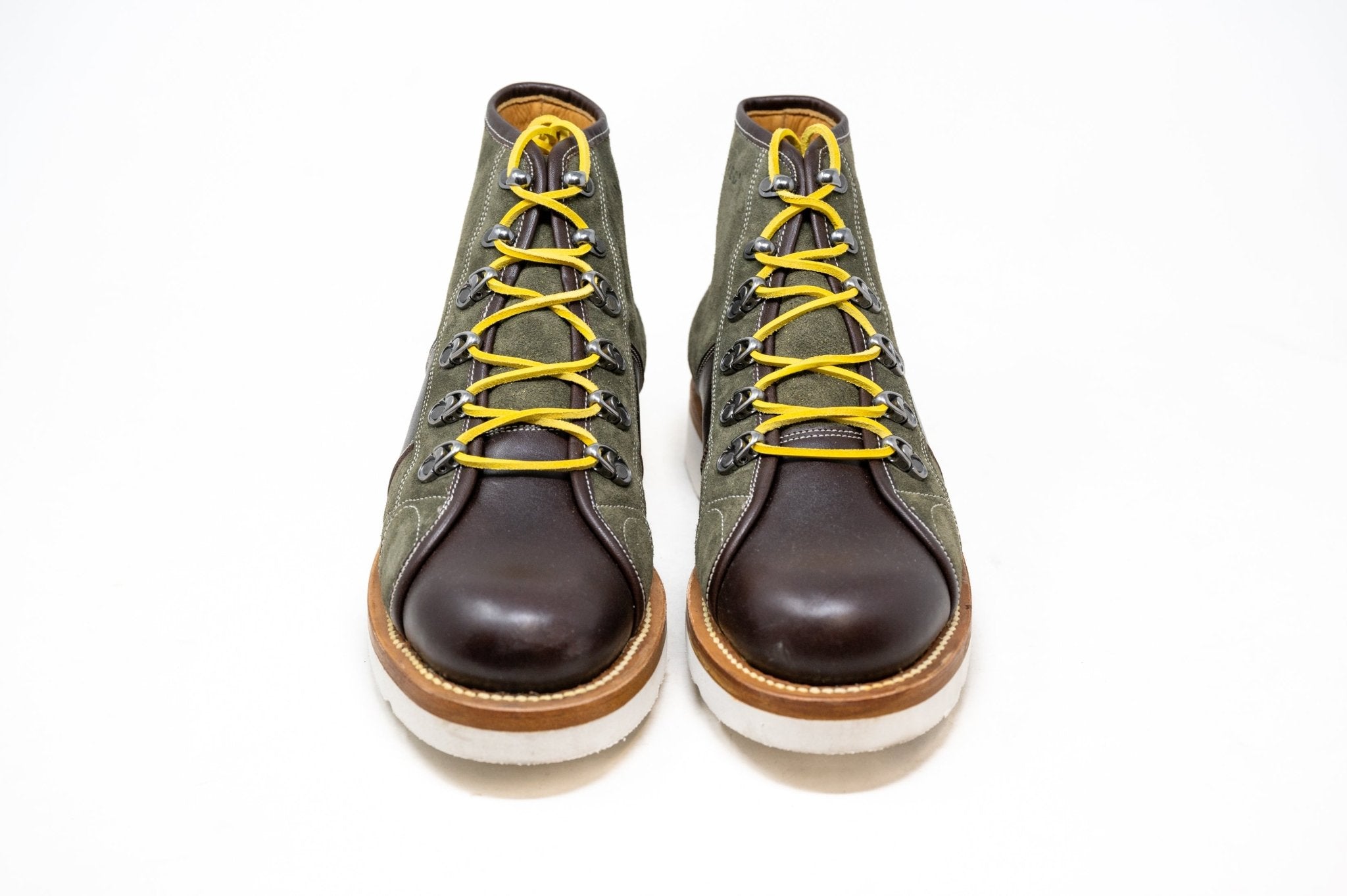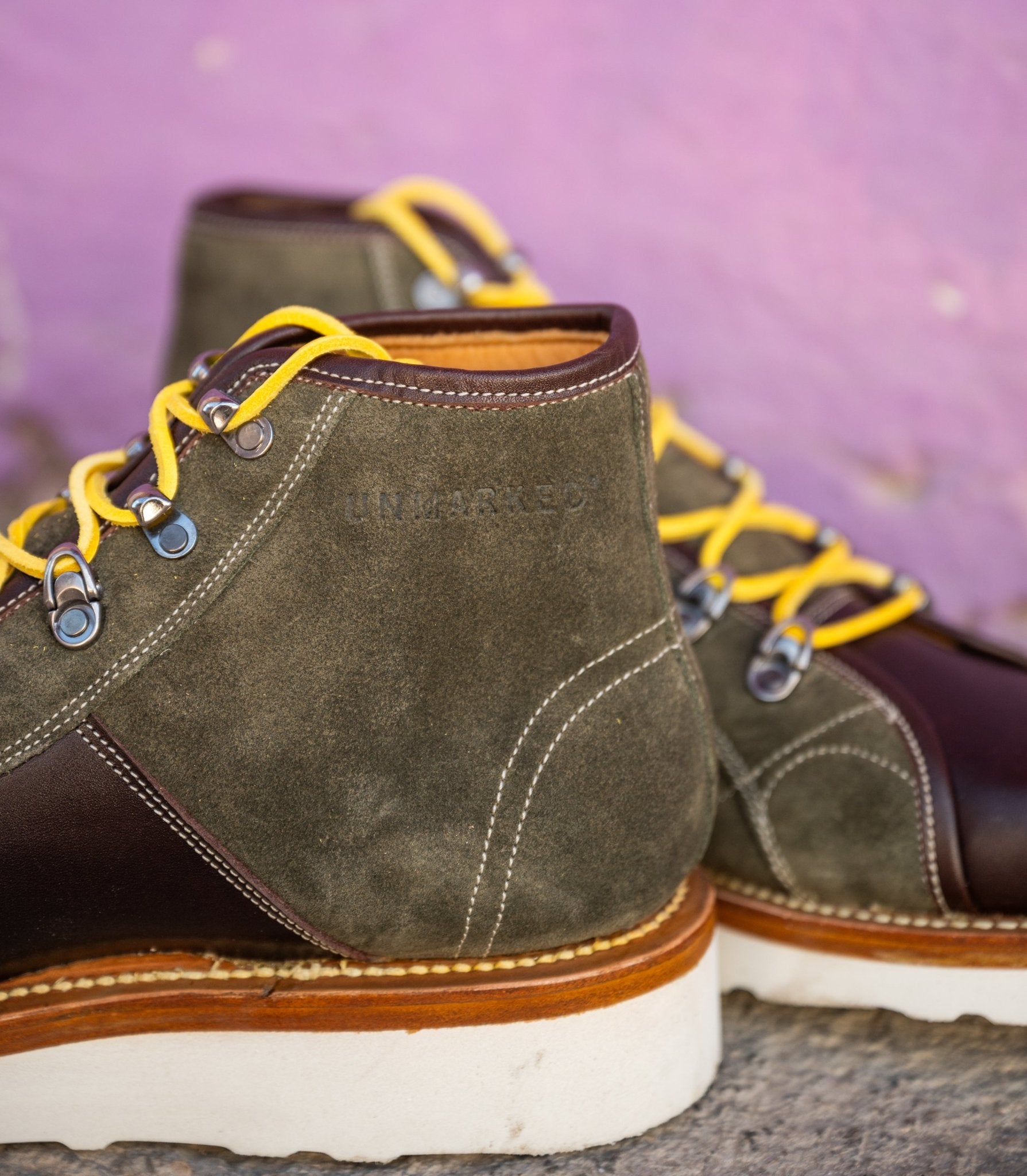 These Unmarked boots blend rugged style with everyday versatility, crafted in olive suede with rich brown pull-up leather accents. Featuring a moc toe design, contrast stitching, and bold yellow hiking laces, they’re set on a lightweight Vibram Christy wedge sole for comfort, grip, and durability. Handcrafted with traditional Goodyear welt construction, they’re built to last while delivering a standout look from city streets to outdoor adventures.